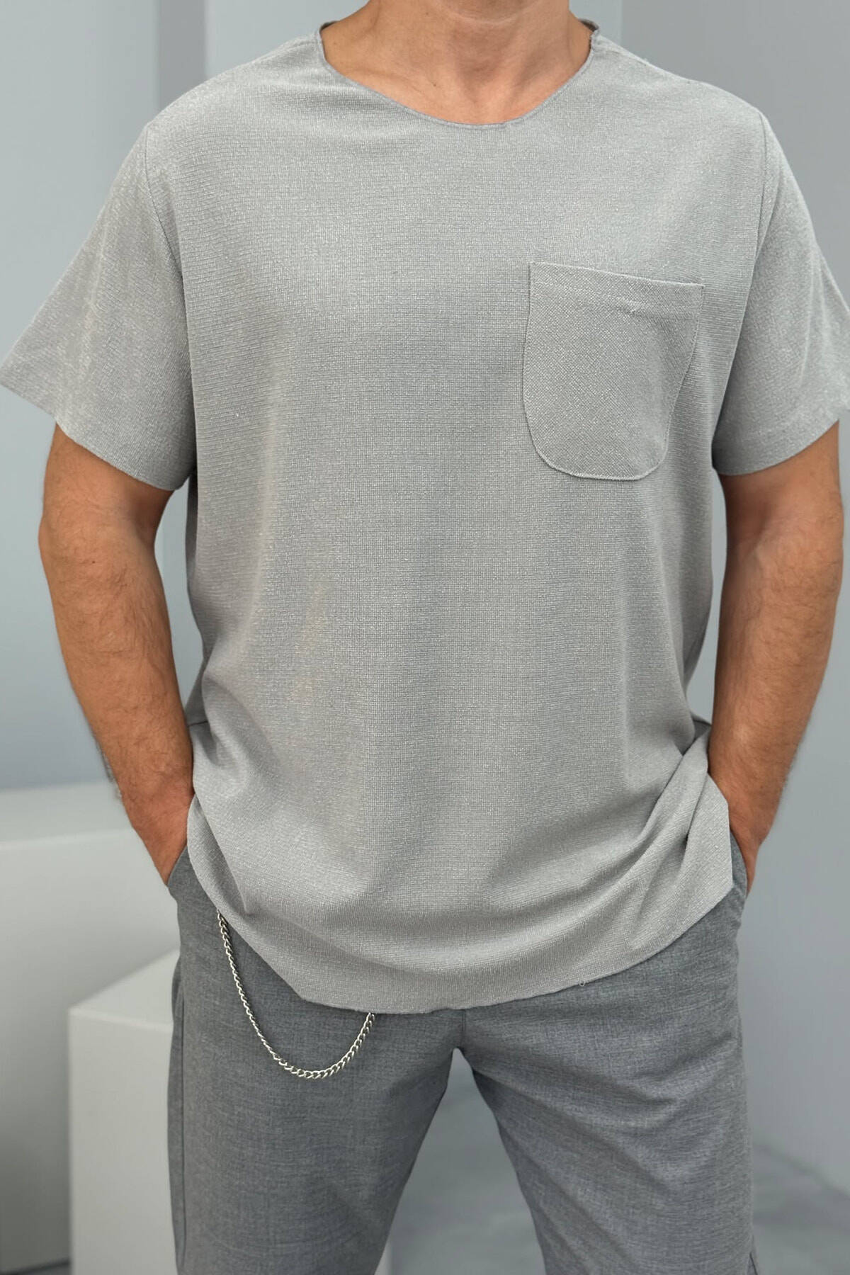 T-SHIRT NJË NGJYRËSH ME XHEP PËR MESHKUJ NË NGJYRËN GRI