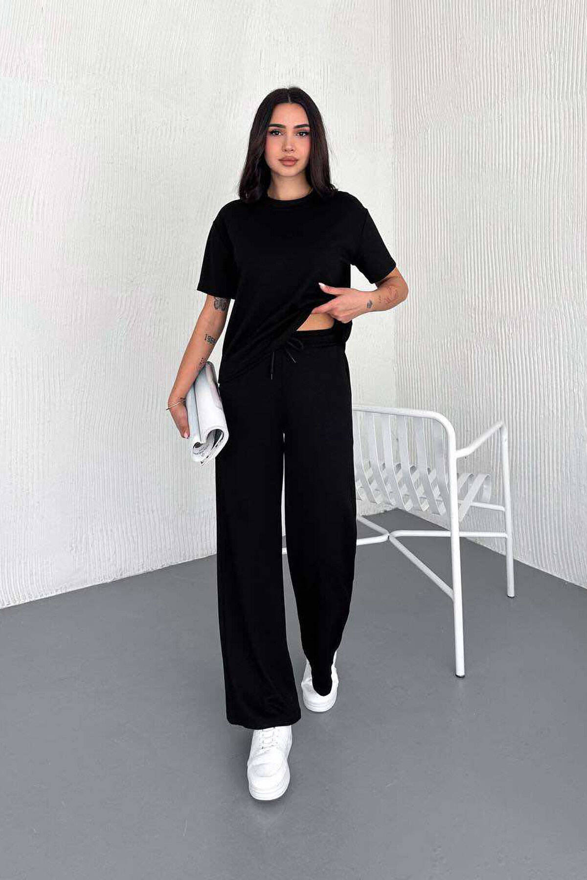 T-SHIRT+TUTA TË GJERA NJË NGJYRËSHE PËR FEMRA NË NGJYRËN E ZEZË