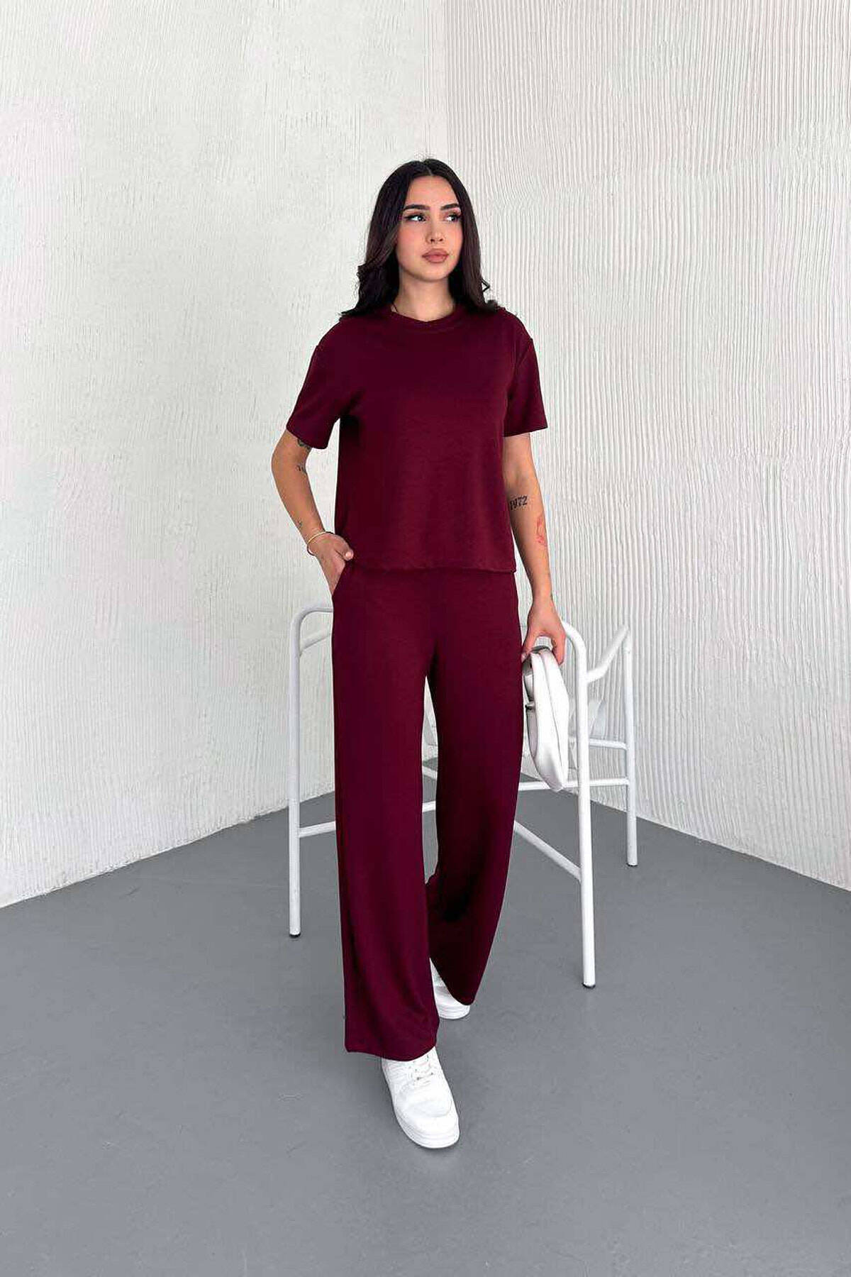 T-SHIRT+TUTA TË GJERA NJË NGJYRËSHE PËR FEMRA NË NGJYRËN VISHNJË