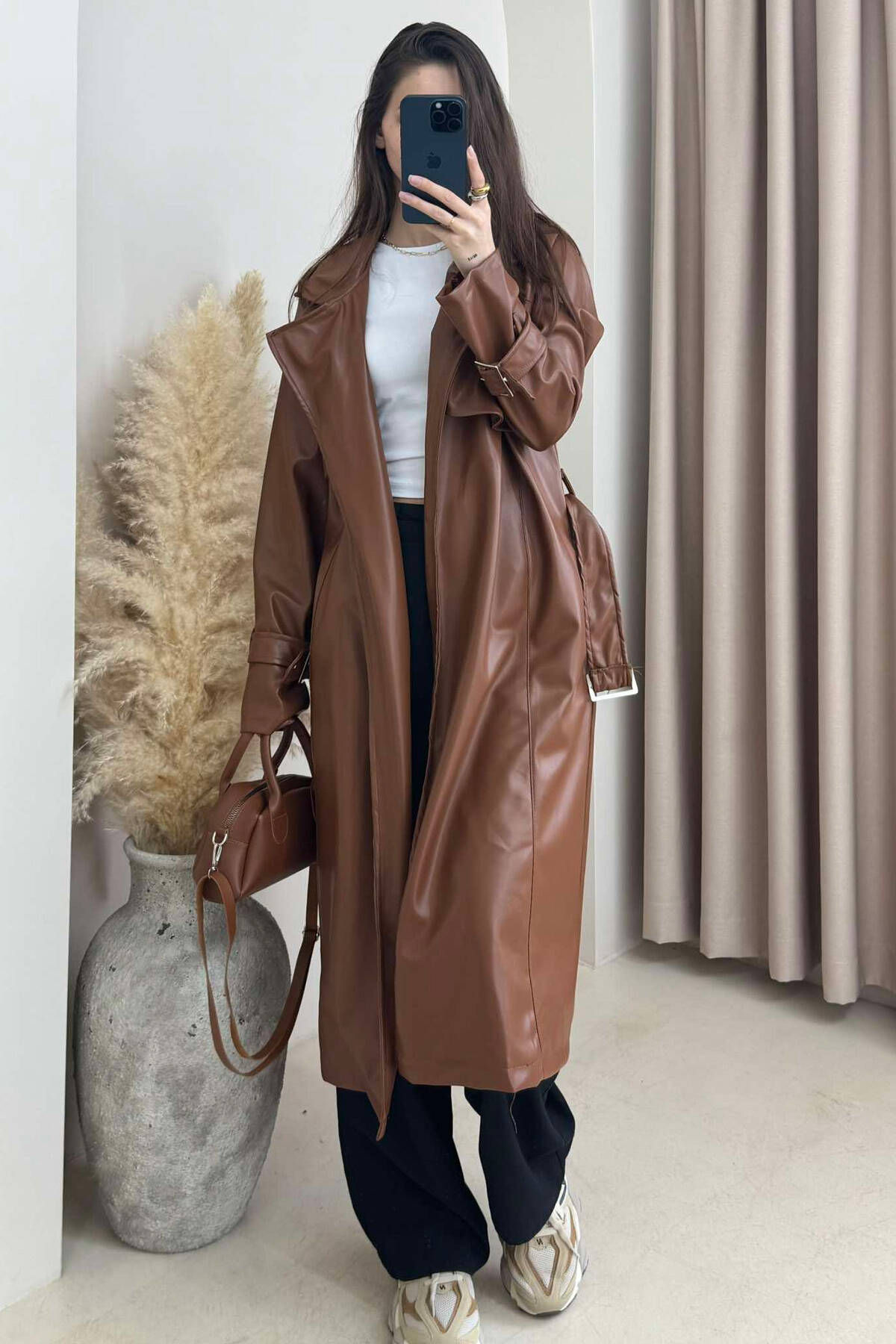 TIED UP BELTED LONG ONE COLOR WOMEN JACKET BROWN/KAFE