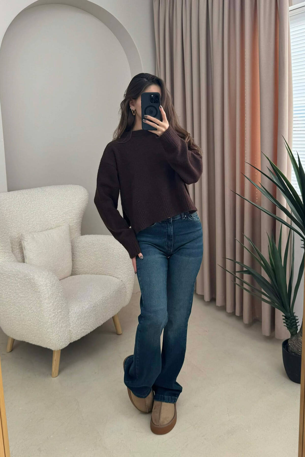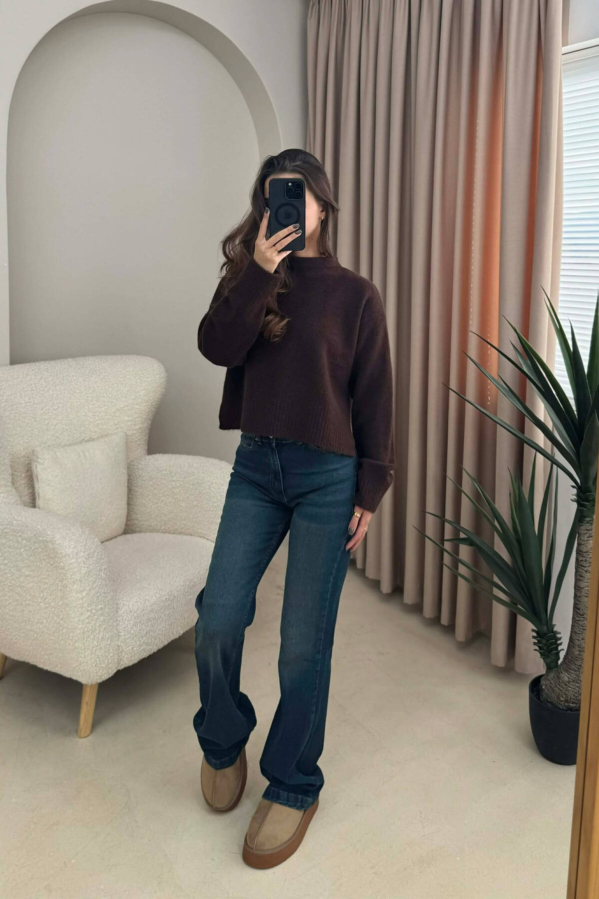 TRIKO E THJESHTË ME JAKË GJYSËM GOLF PËR FEMRA NË NGJYRË KAFE TË ERRËT
