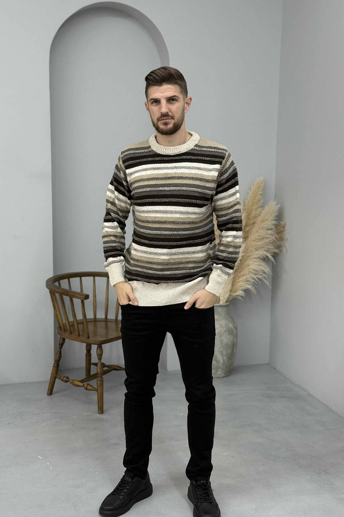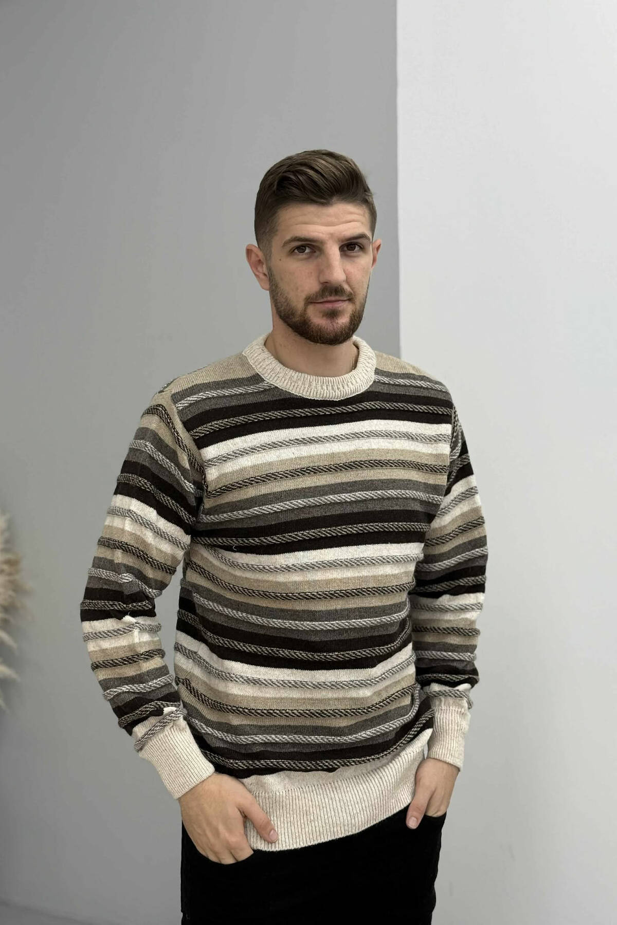 SIMPLE KNITTED STRIPES MEN SWEATER BEIGE/BEZHE
