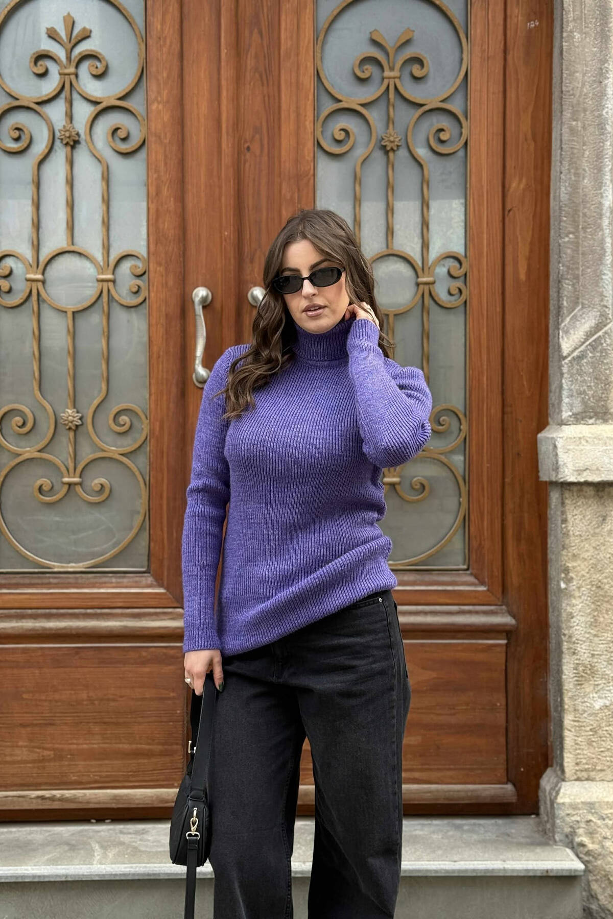 HIGH NECK SIMPLE ONE COLOR WOMEN SWEATER DARK BLUE/BEE