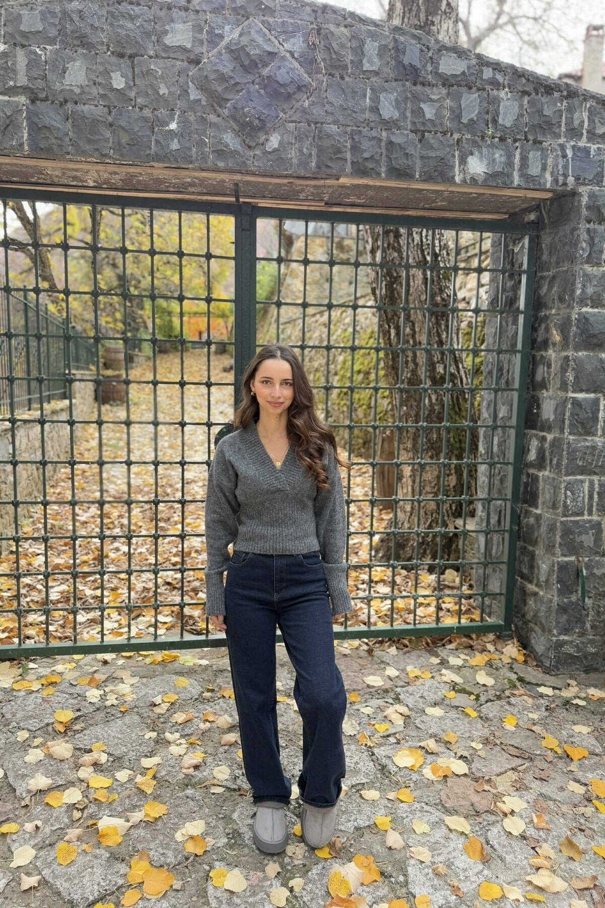 TRIKO E THJESHTË NJË NGJYRËSHE ME JAKË V PËR FEMRA NË NGJYRË GRI TË ERRËT