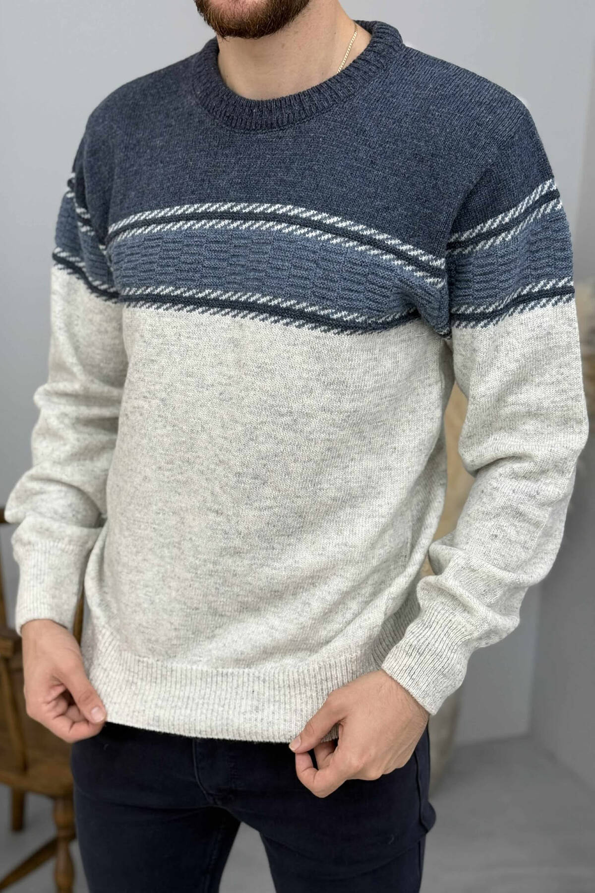 ROUND NECK STRIPED MEN SWEATER BLUE/BLU