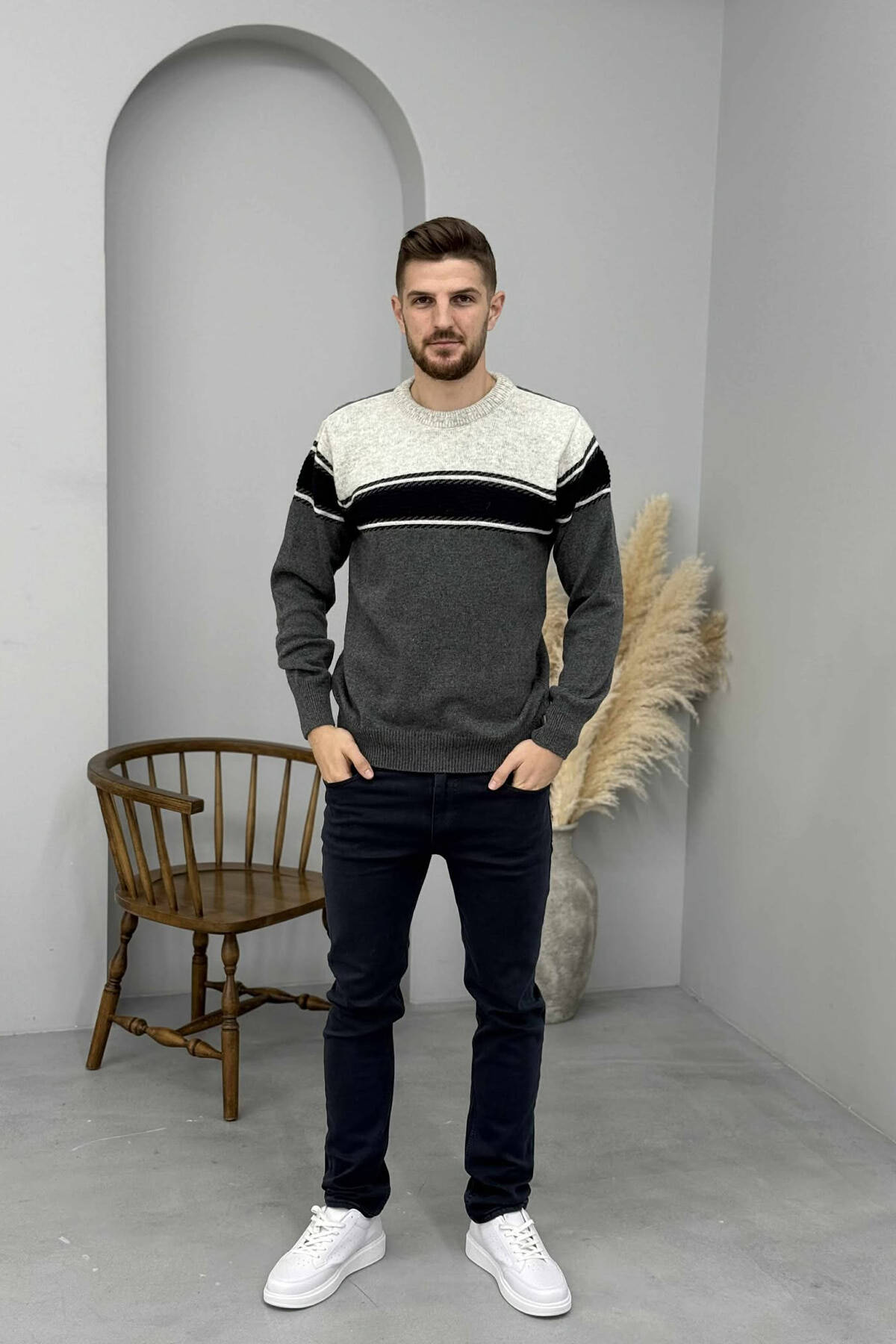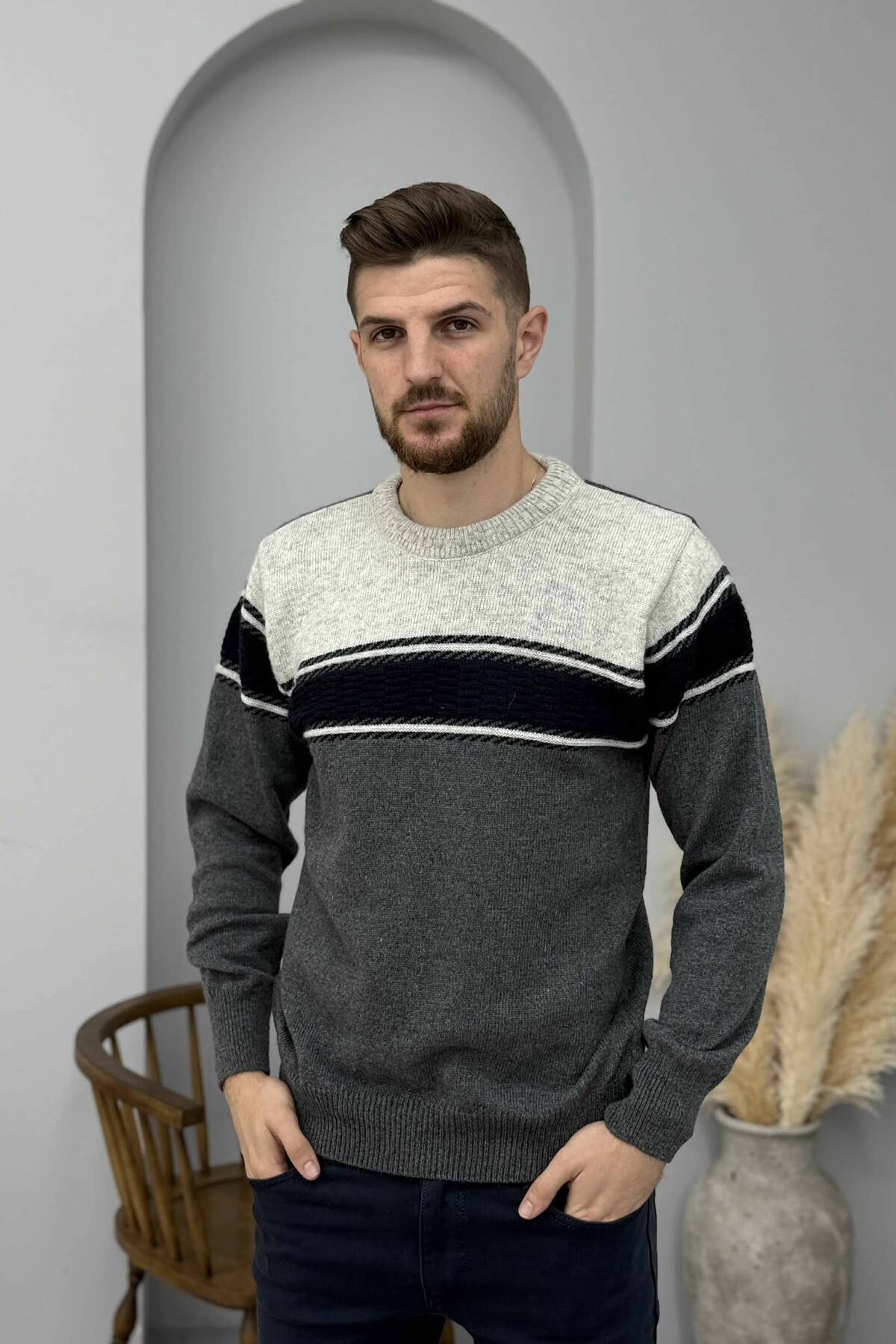ROUND NECK STRIPED MEN SWEATER GREEN/JESHILE