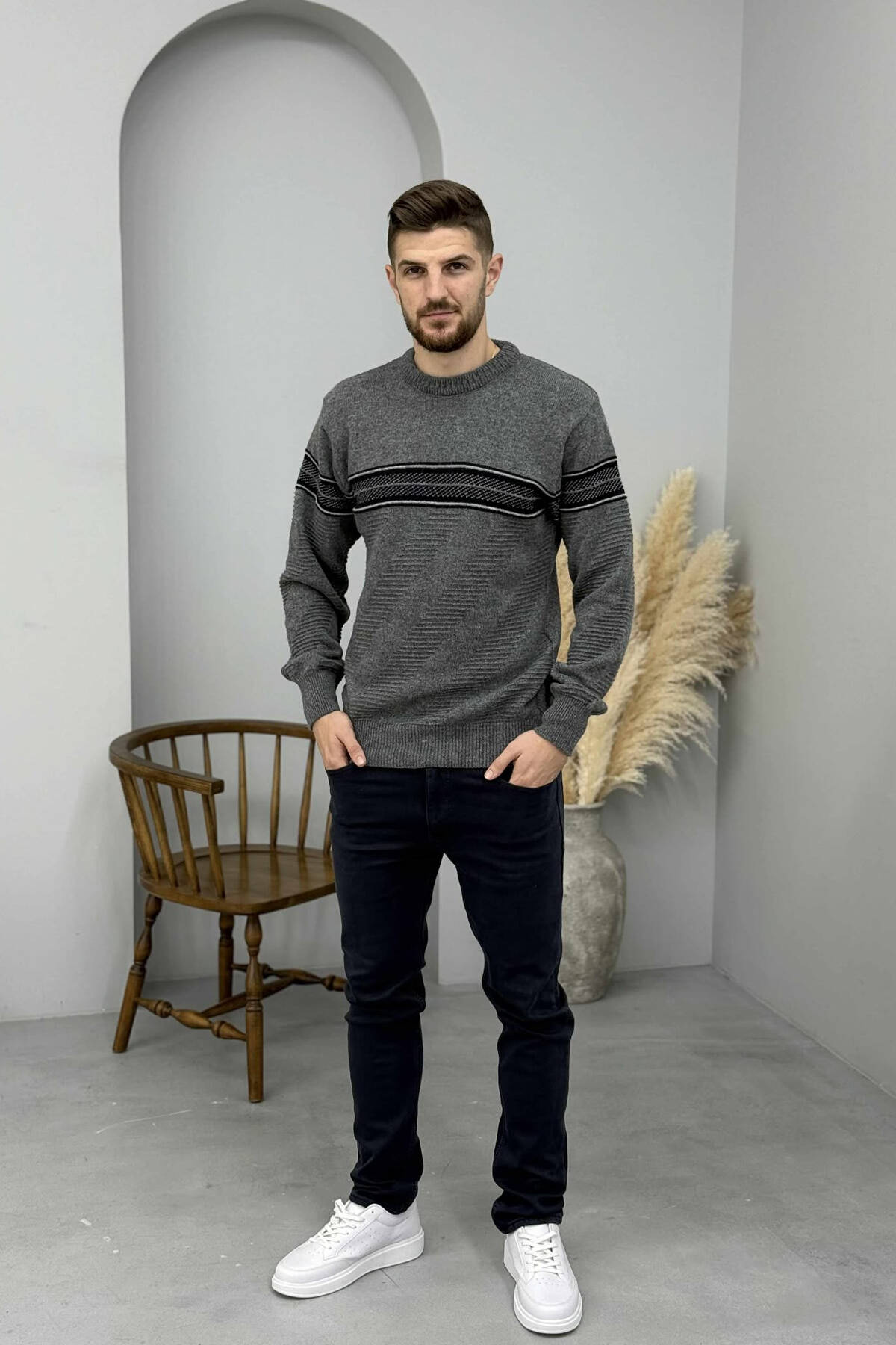 KNITTED STRIPE DESIGN MEN SWEATER DARK BLUE/BEE