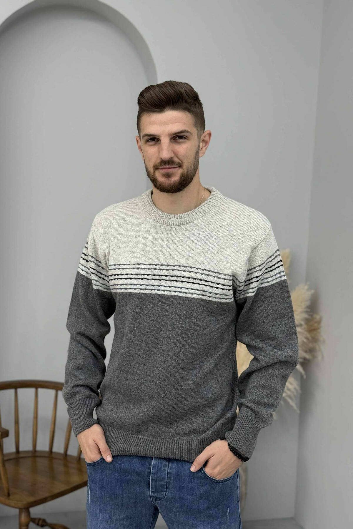 ROUND NECK STRIPED MEN SWEATER GREEN/JESHILE