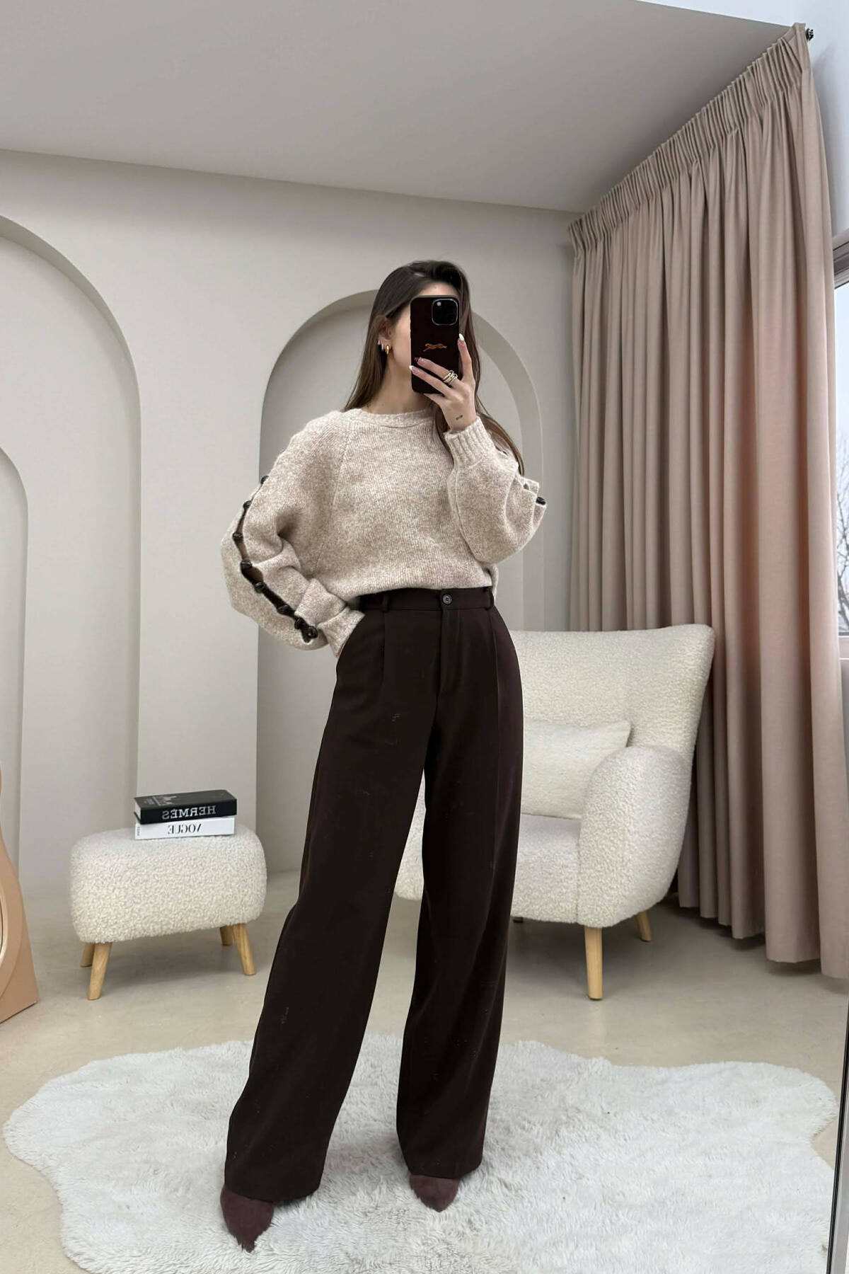 PULOVER ME JAKE RRETHORE DHE XHEPA PER FEMRA NE NGJYRE KAFE