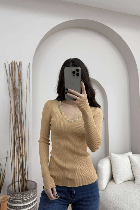 TRIKO ME DETAJIN E PERLAVE PËR FEMRA NË NGJYRËN BEZHË