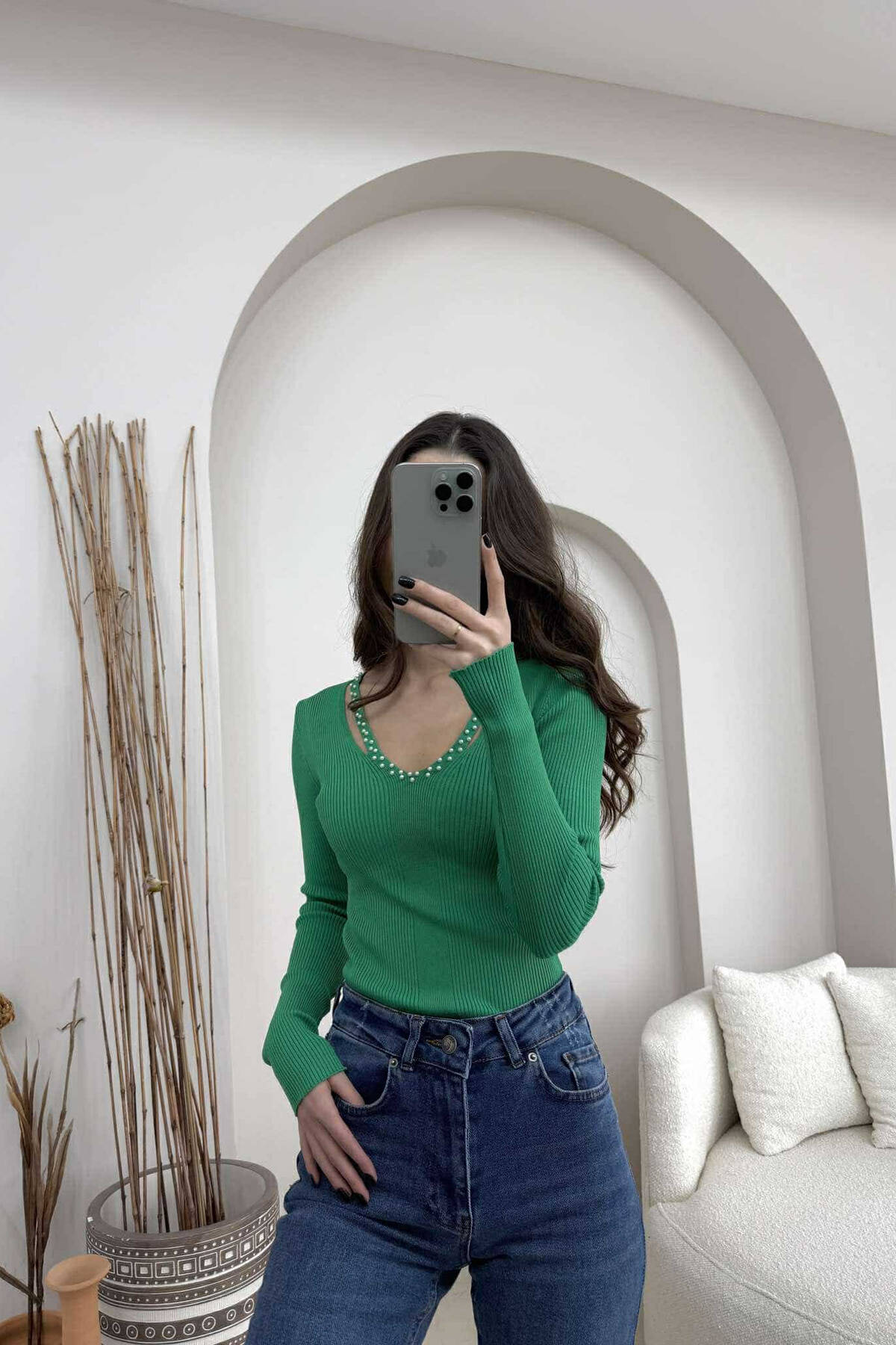 TRIKO ME DETAJIN E PERLAVE PËR FEMRA NË NGJYRËN JESHILE