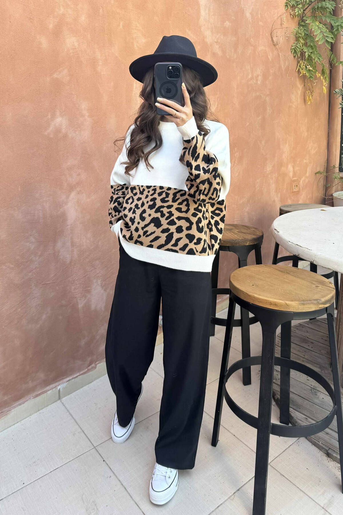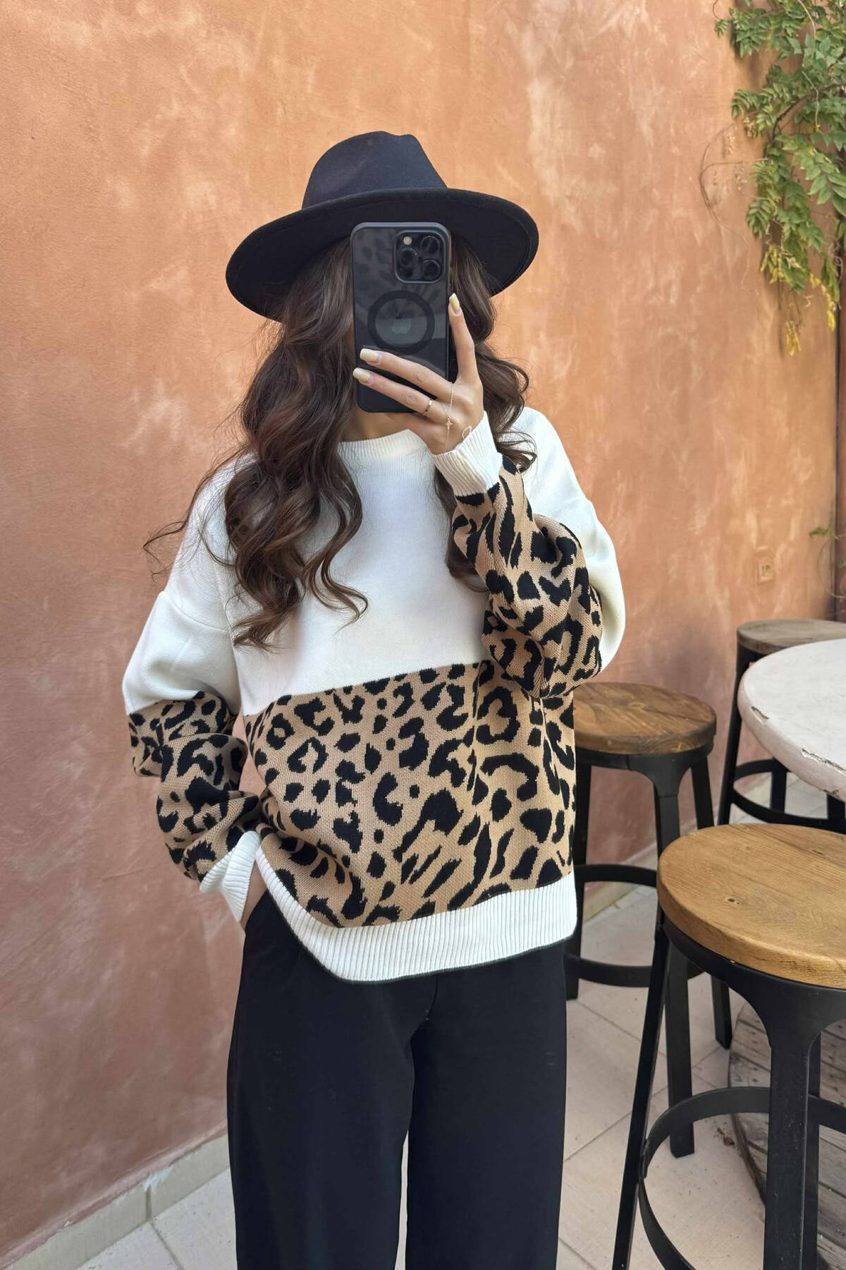 TRIKO ME JAKË TË RRUMBULLAKËT DHE DIZANJ LEOPARD PËR FEMRA NË NGJYRËN E BARDHË