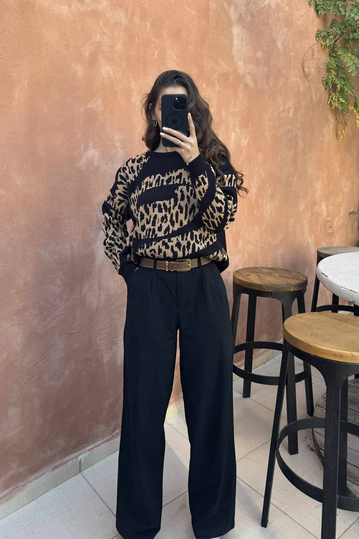TRIKO ME JAKË TË RRUMBULLAKÊT DHE DIZANJ LEOPARDI PËR FEMRA NË NGJYRËN E ZEZË