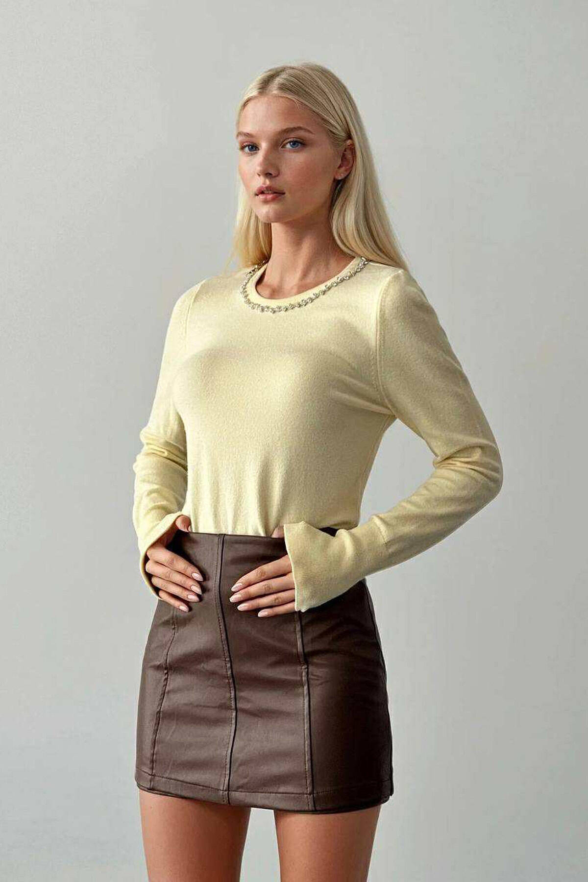 TRIKO ME JAKË TË RRUMBULLAKET ME DETAJE GURËSH ME SHKËLQIM PËR FEMRA NË NGJYRË LIMONI