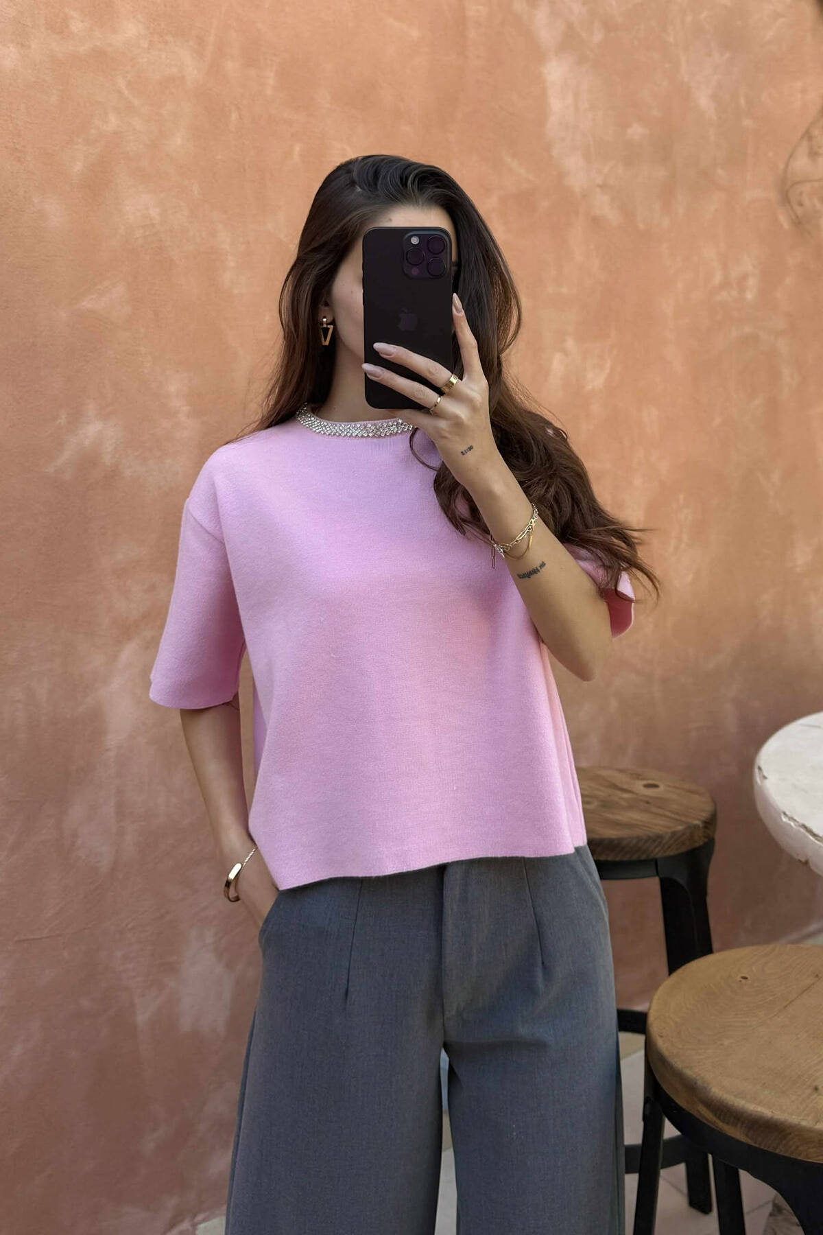 TRIKO ME MËNGË TË SHKURTRA DHE GURË TË SHËNDRITSHËM PËR FEMRA NË NGJYRËN ROZË