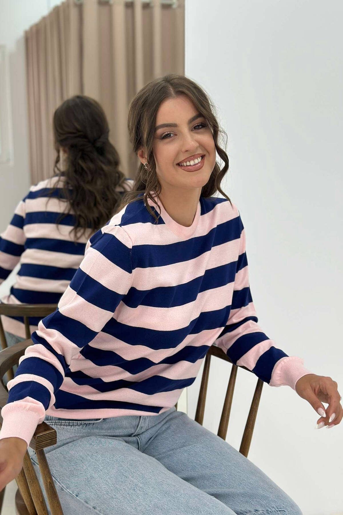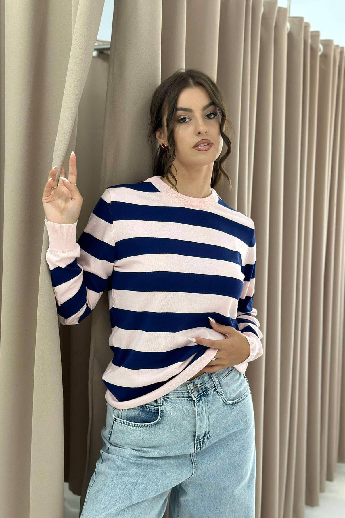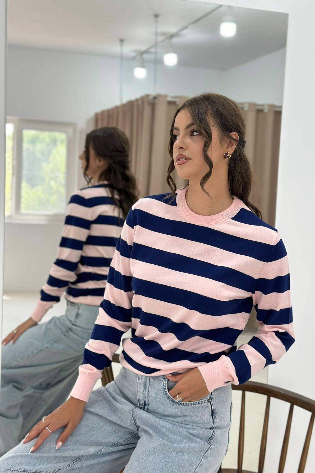 Bejeni tuajen triko me vija horizontale , me jake te rrumbullaket , vjen ne nje material fantastik , shume komode dhe perfekte per kombinimet tuaja te perditshme ne shkolle apo pune .