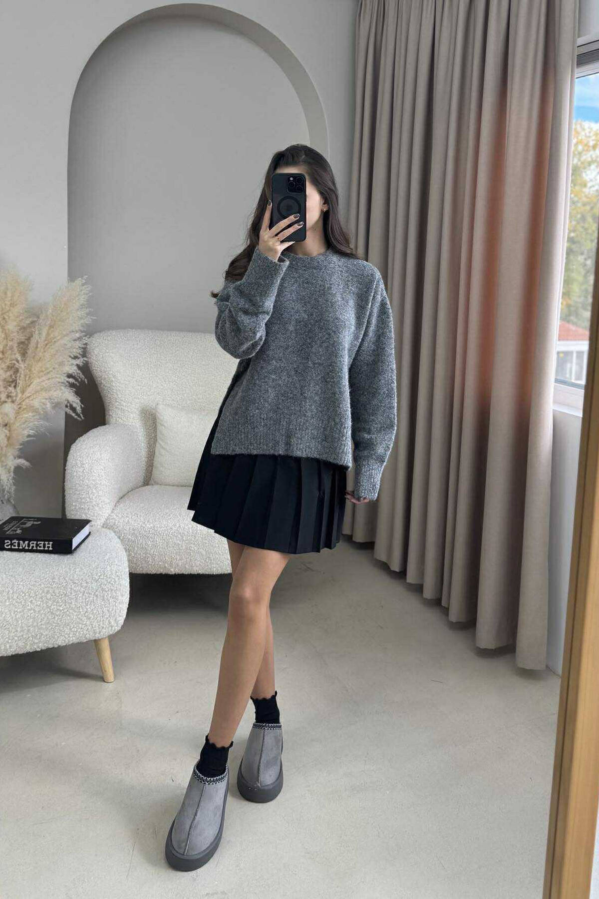 TRIKO NJË NGJYRËSHE ME JAKË TË RRUMBULLAKËT PËR FEMRA NË NGJYRË GRI TË ERRËT
