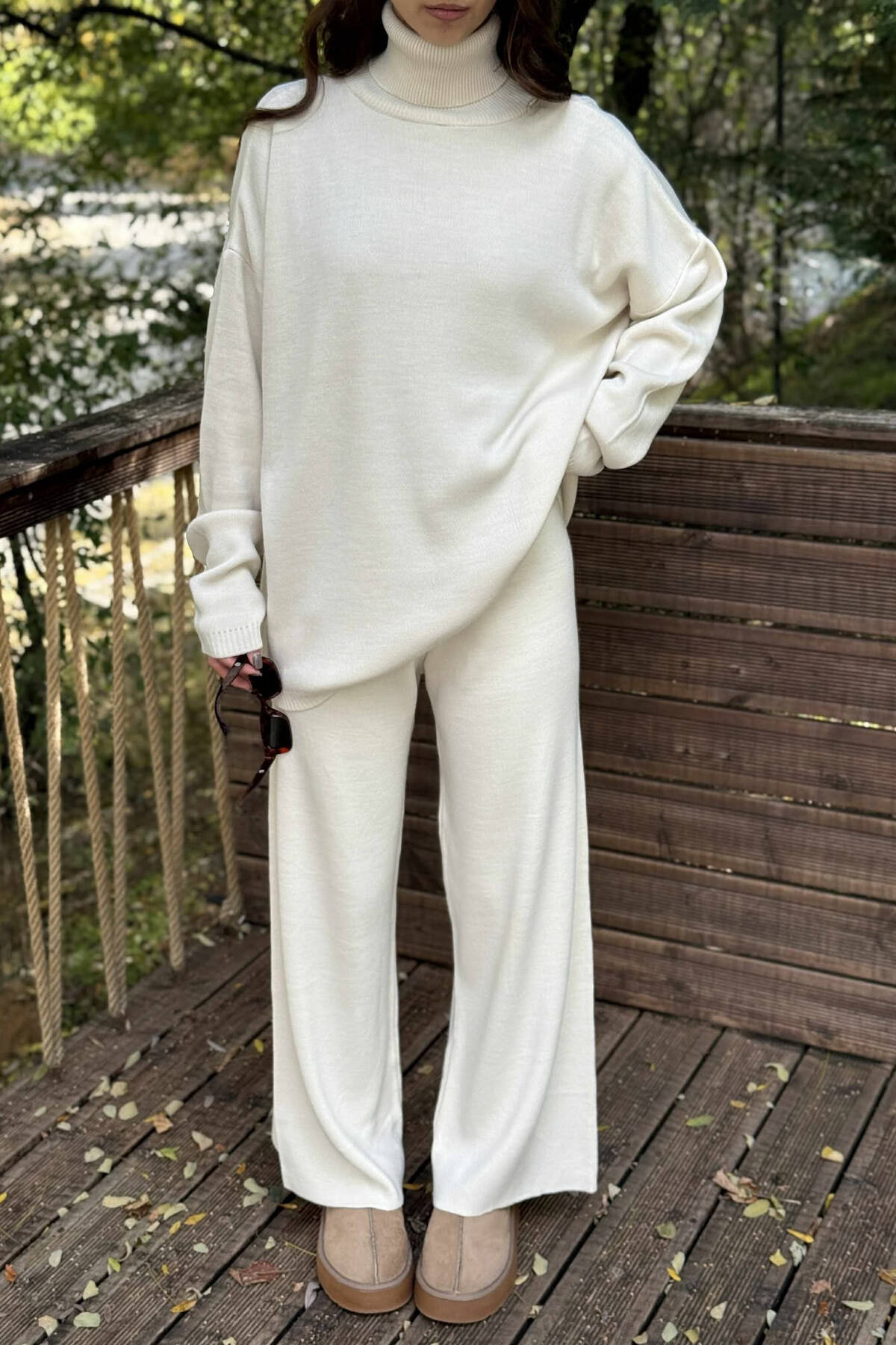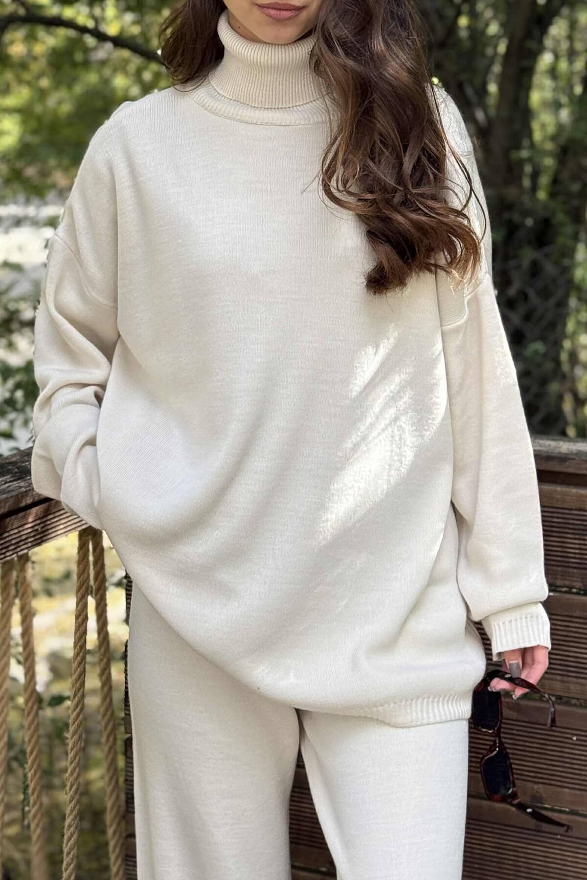 TURTLE NECK SWEATER+TROUSERS WOMEN KNIT SET CREAM/KREM
