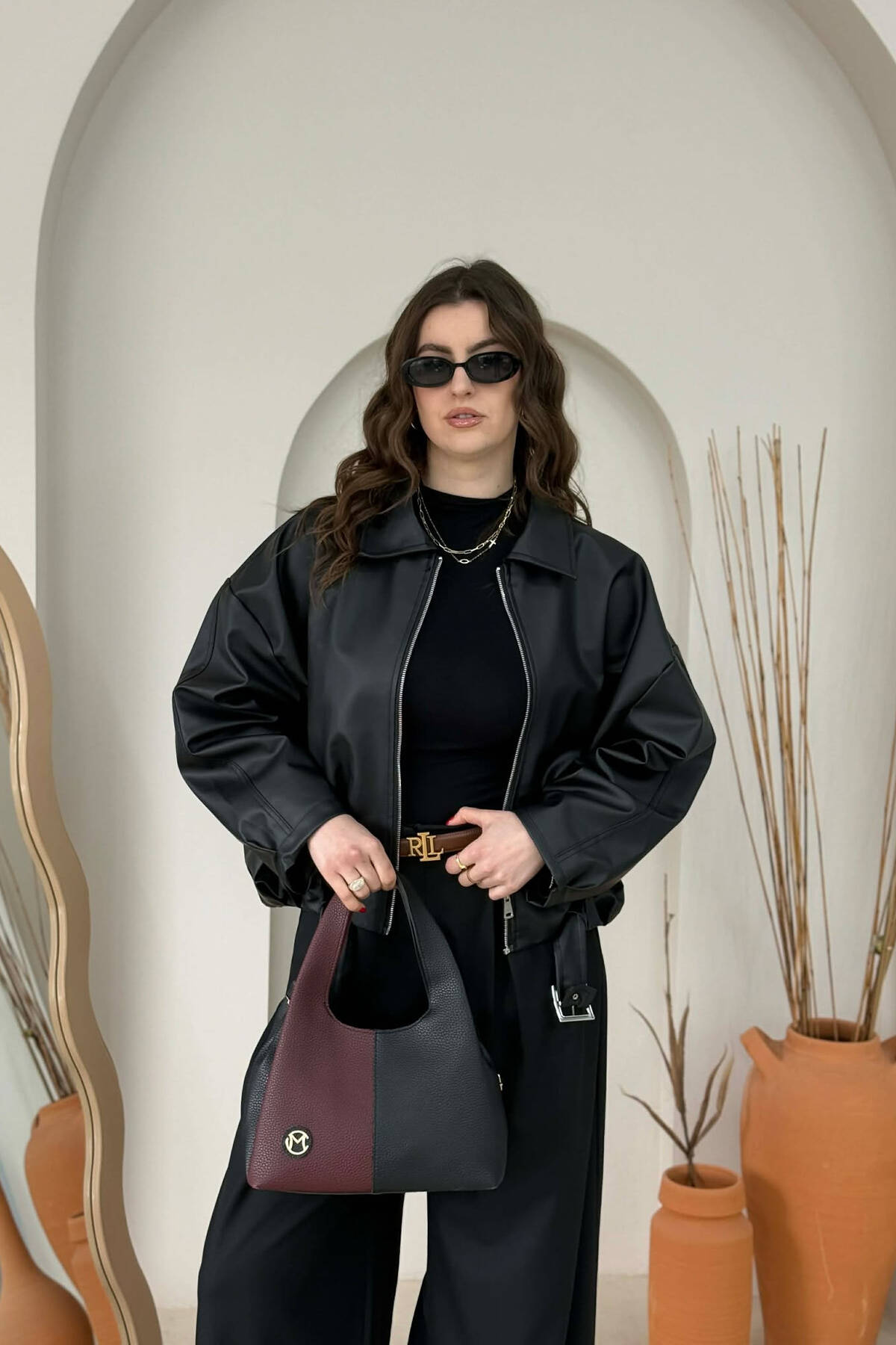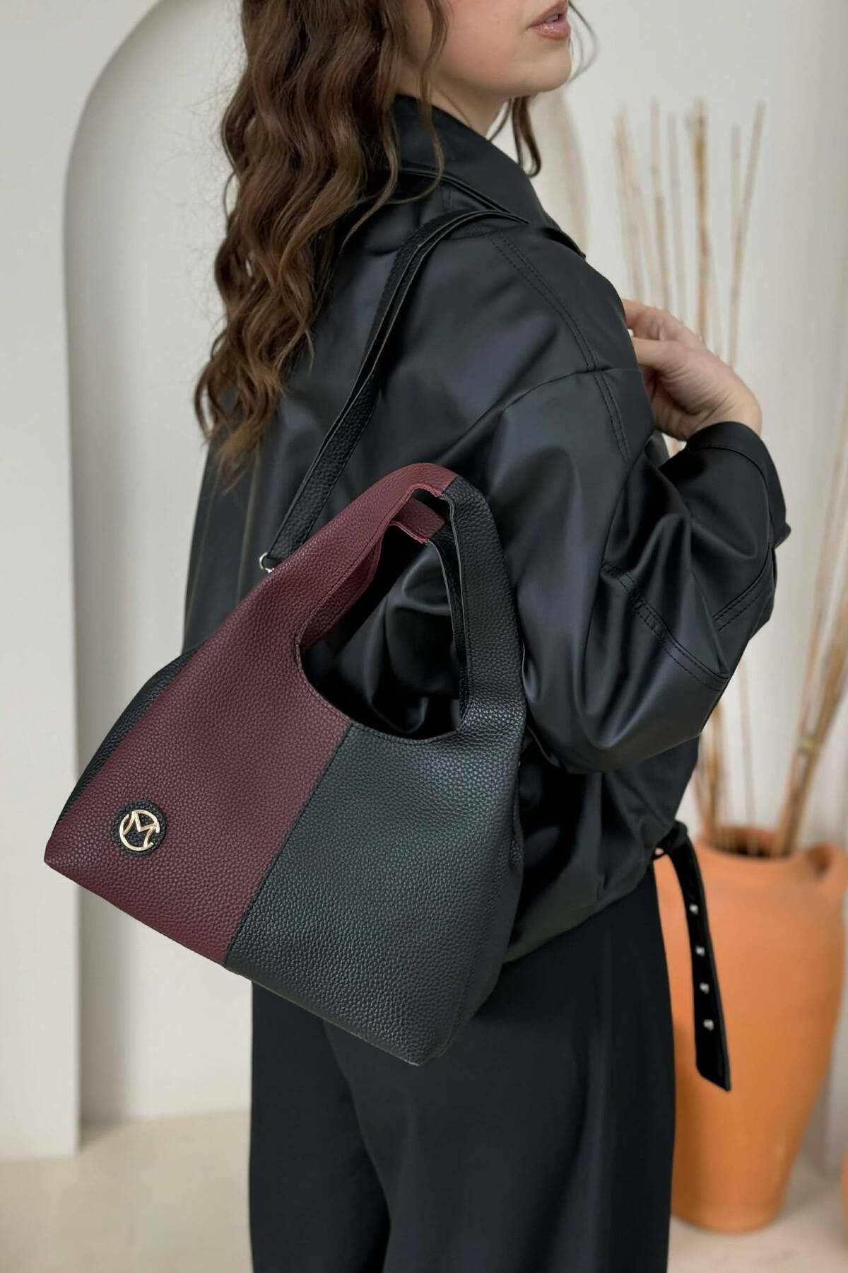 TWO COLORS LEATHER WOMAN BAG BLACK-BURGUNDY/ZEVI