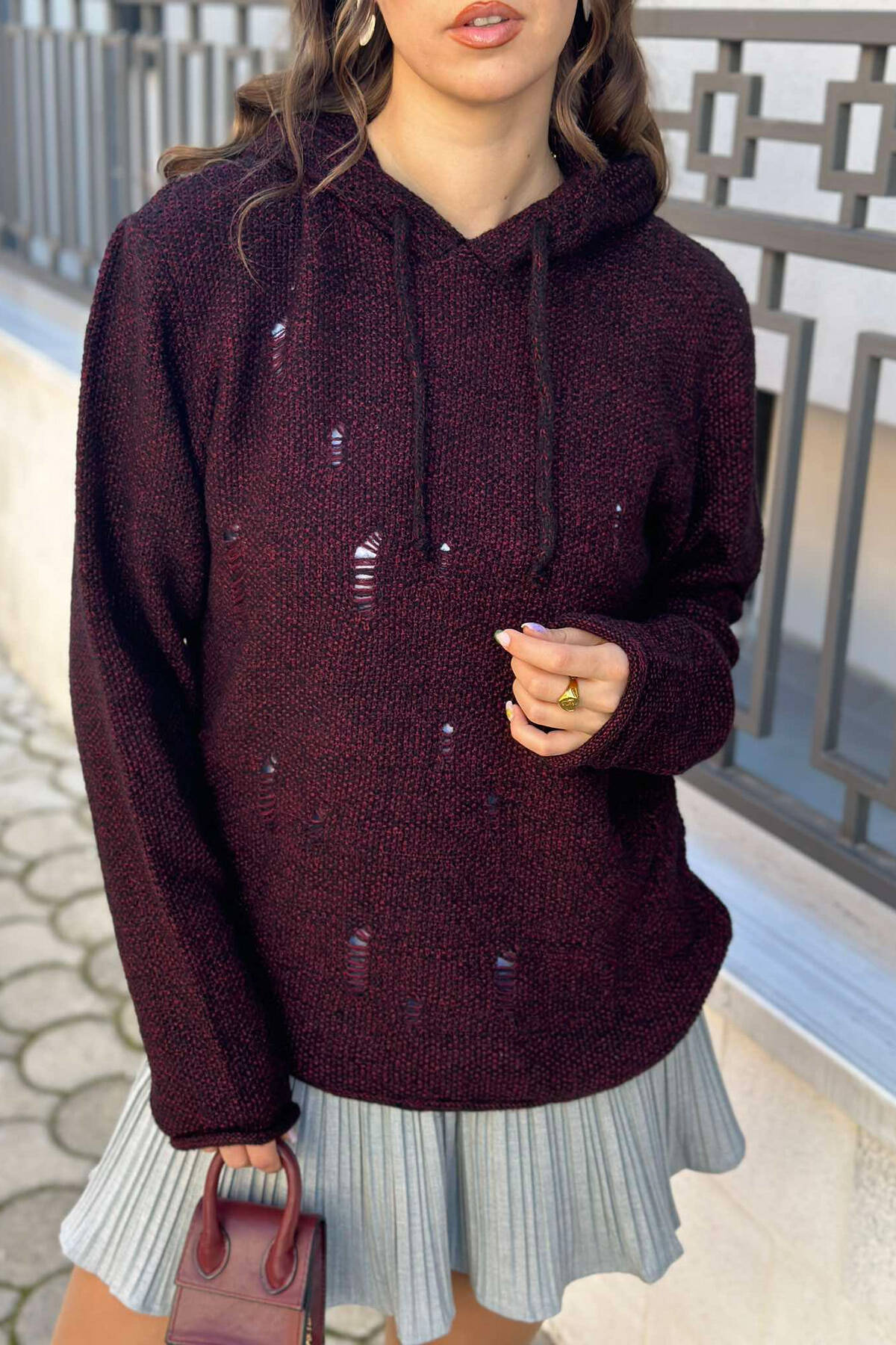 ONE COLOR LACE DETAIL WOMAN SWEATER BURGUNDY/VISHNJE