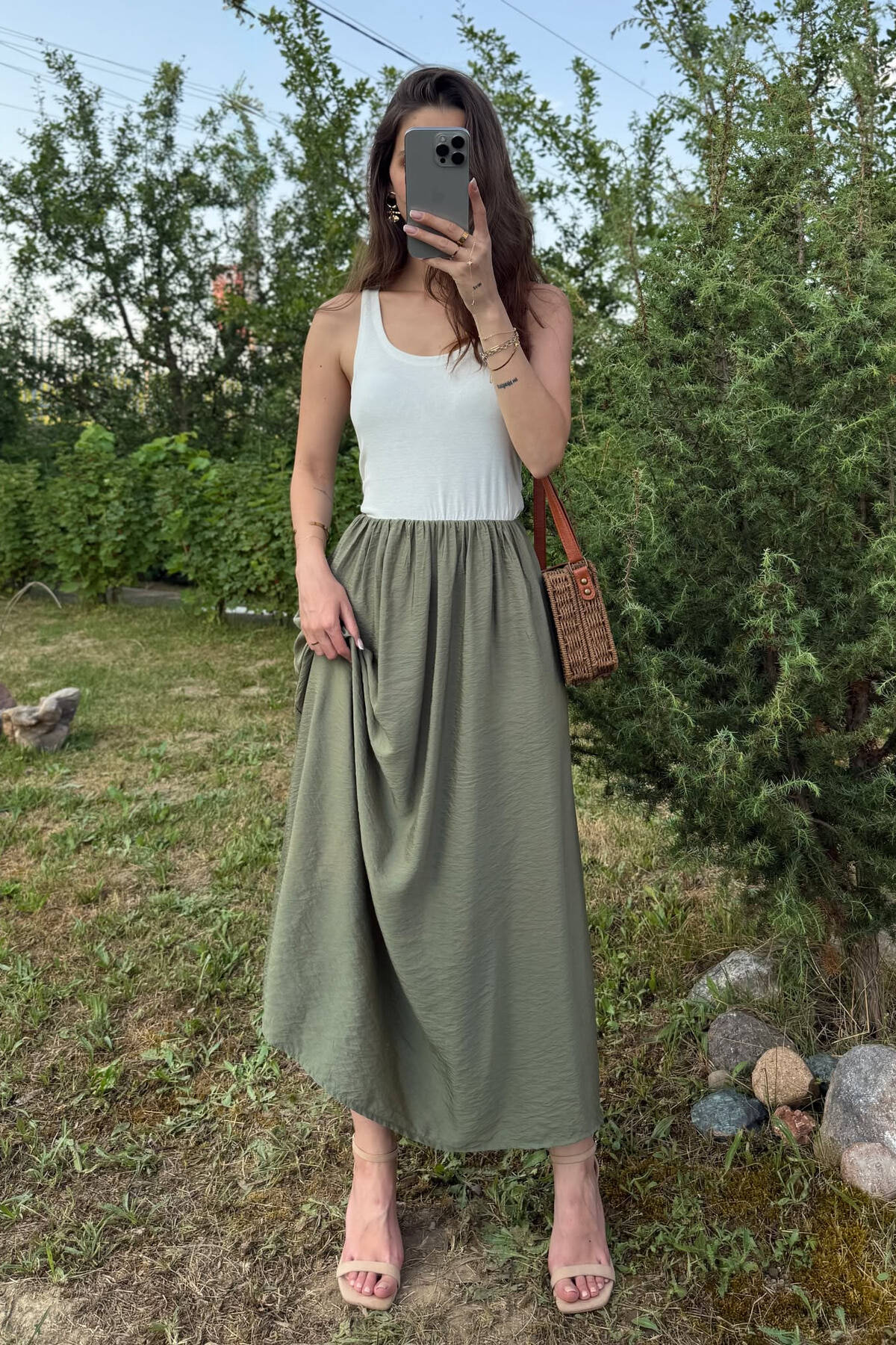 TWO COLORS THICK STRAPS LONG WOMEN DRESS WHITE/GREEN-BAJE