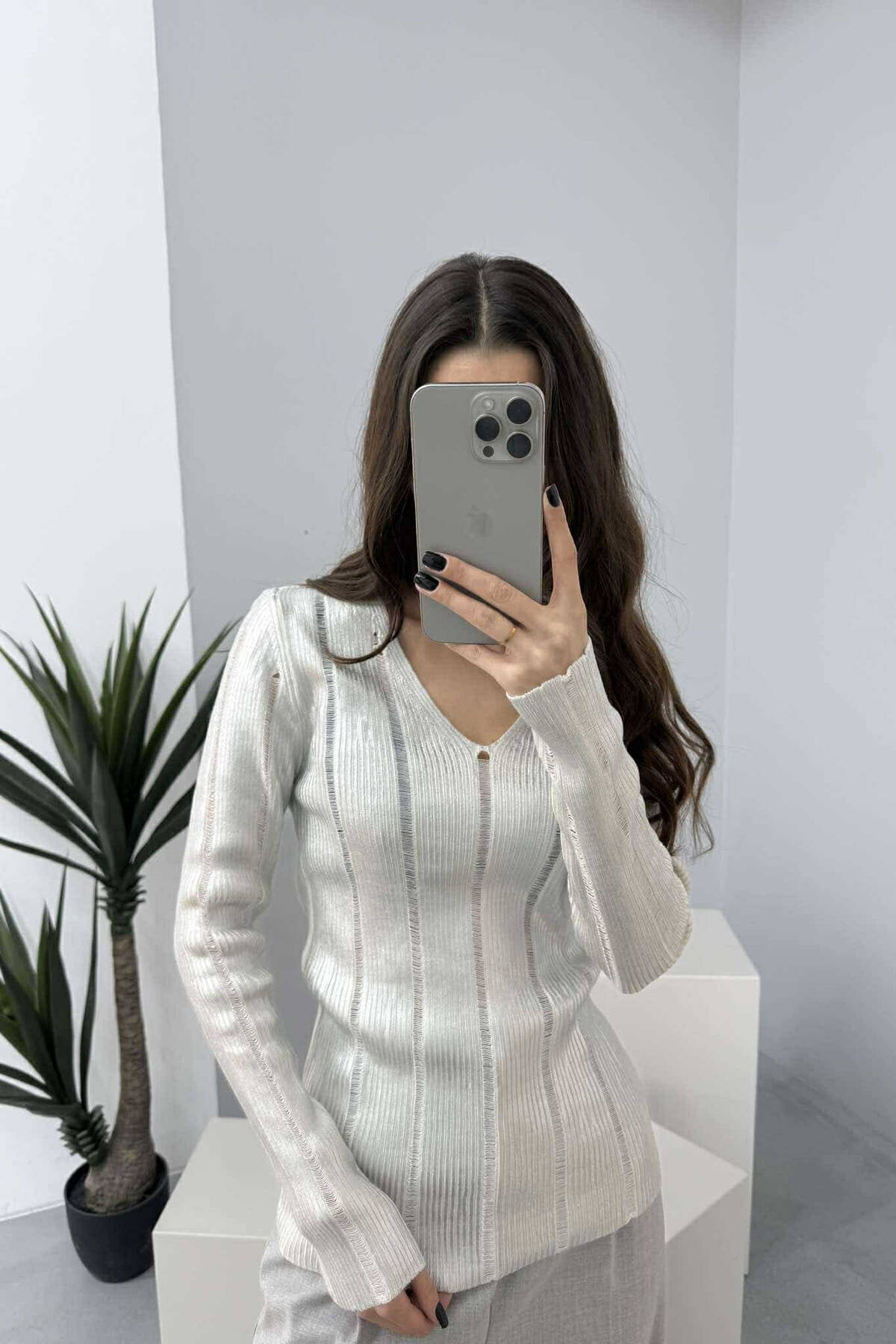 V NECK SIMPLE SHINY WOMEN SWEATER WHITE-E BARDHE