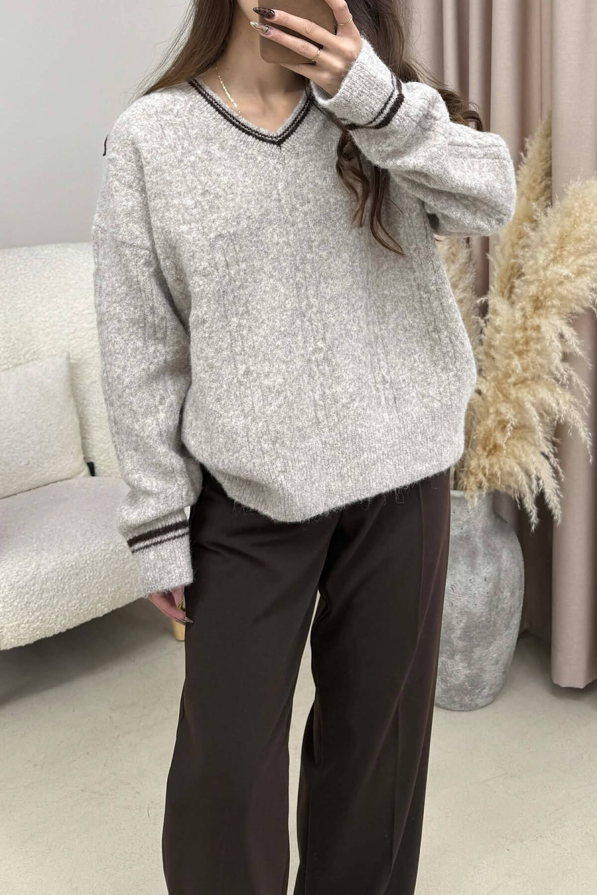 V NECK SLEEVE BUTTONS WOMEN SWEATER GREY/GRI