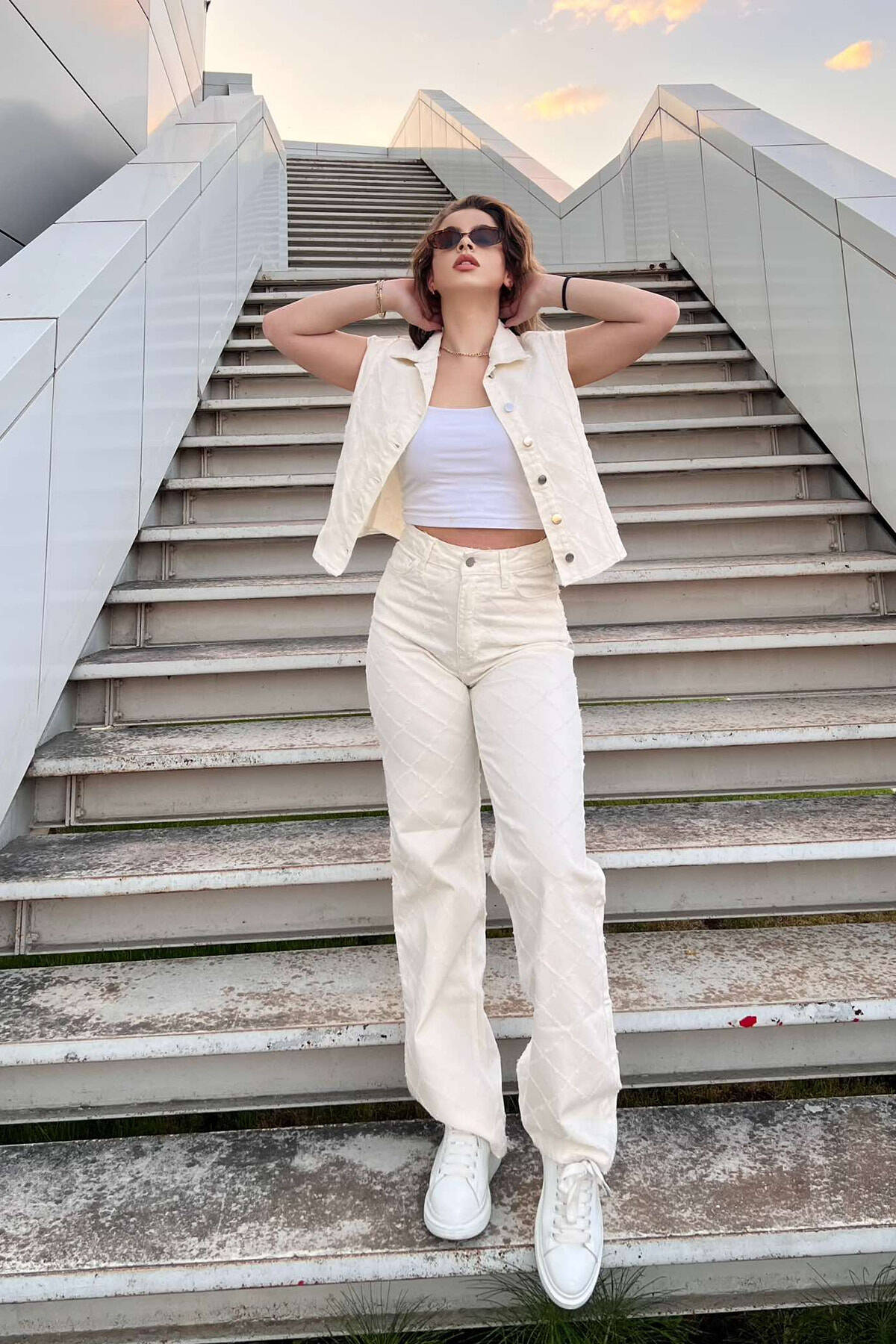 VEST+JEANS ONE COLOR DENIM WOMEN SET CREAM/KREM