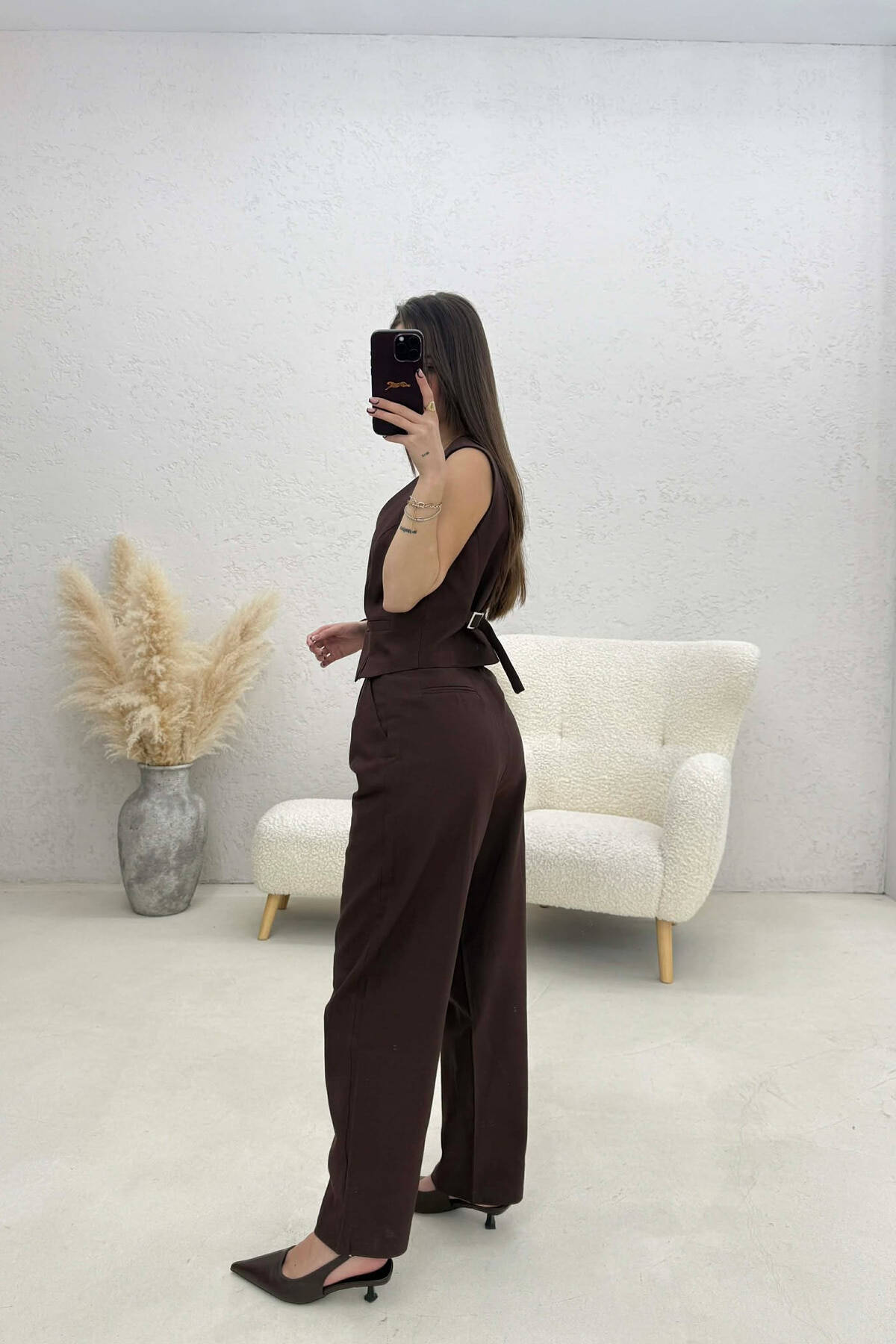 SET NJË NGJYRËSH JELEK+PANTALLONA PËR FEMRA NË NGJYRË KAFE