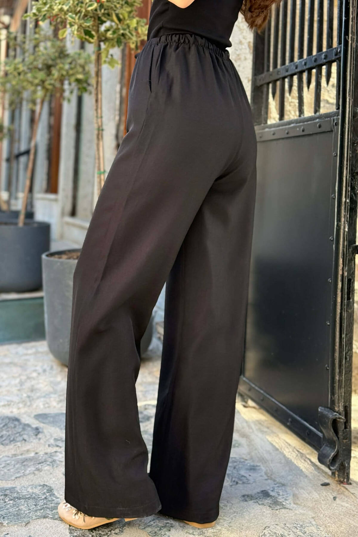 WIDE LEG ELASTIC WAIST LACING DETAIL WOMAN TROUSERS BLACK/ E ZEZE