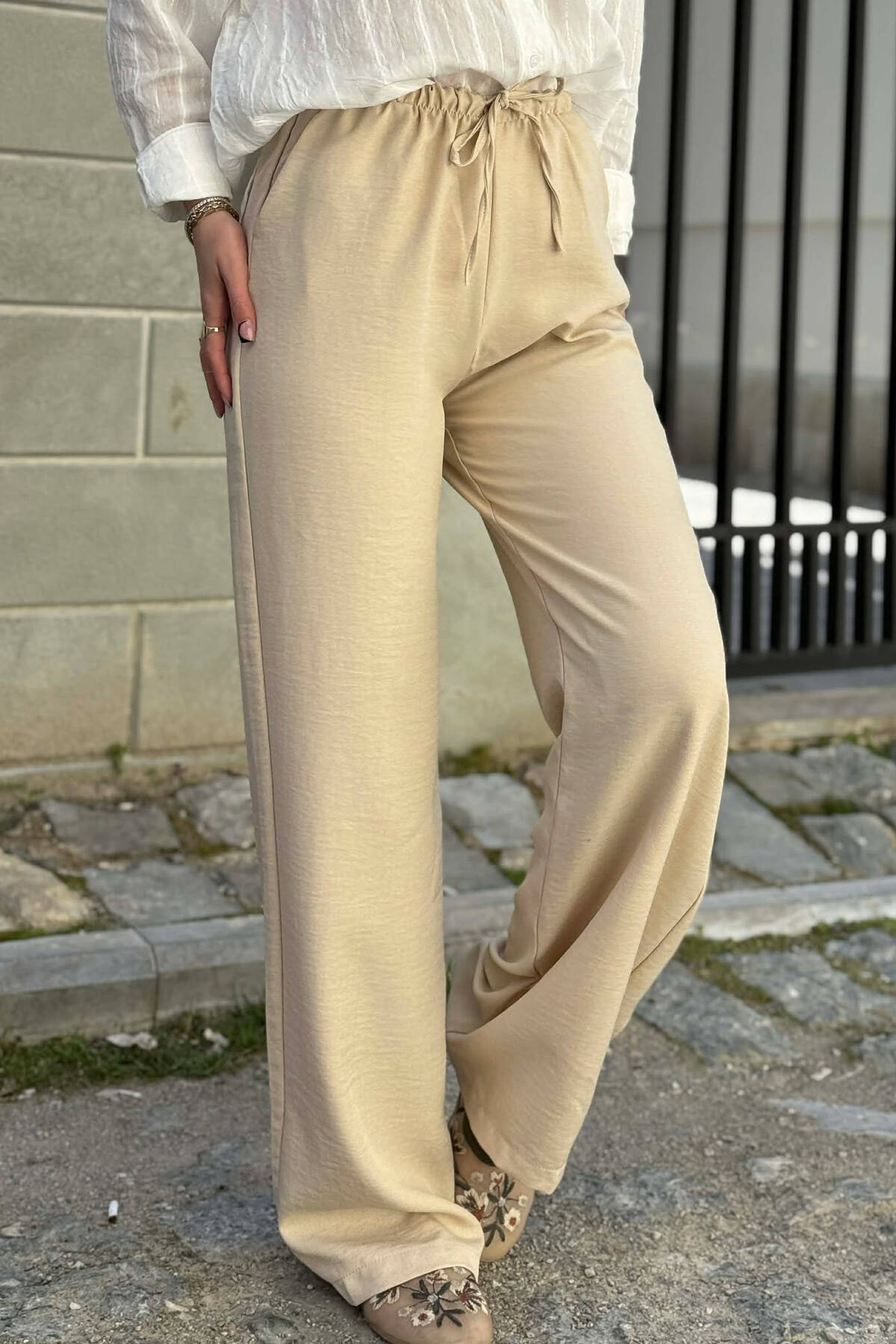 WIDE LEG ELASTIC WAIST LACING DETAIL WOMAN TROUSERS CREAM/KREM