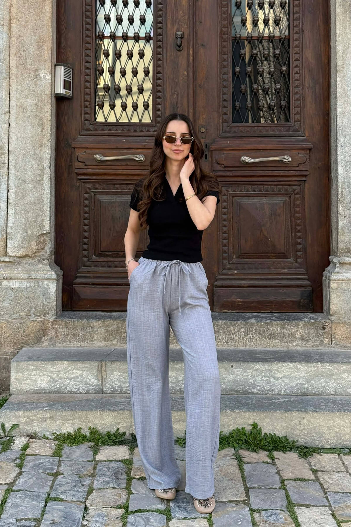 WIDE LEG ELASTIC WAIST LACING DETAIL WOMAN TROUSERS GREY/GRI