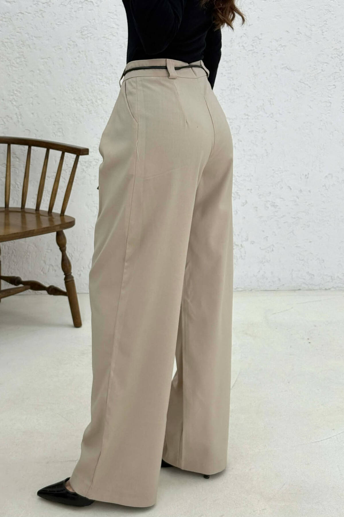 ELASTIC WAIST BELTED WOMEN TROUSERS BEIGE/BEZHE
