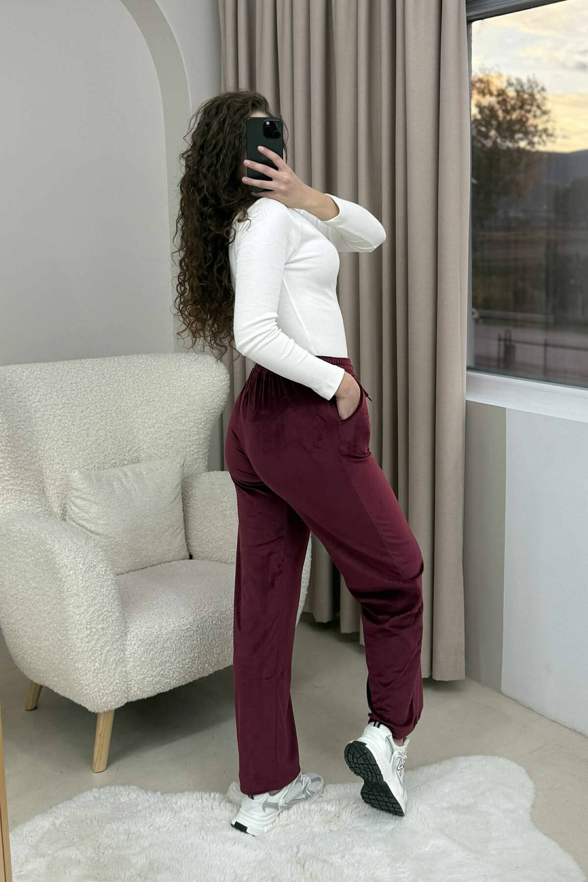 WIDE LEG ONE COLOR VELVET WOMEN SWEATPANTS BURGUNDY/VISHNJE