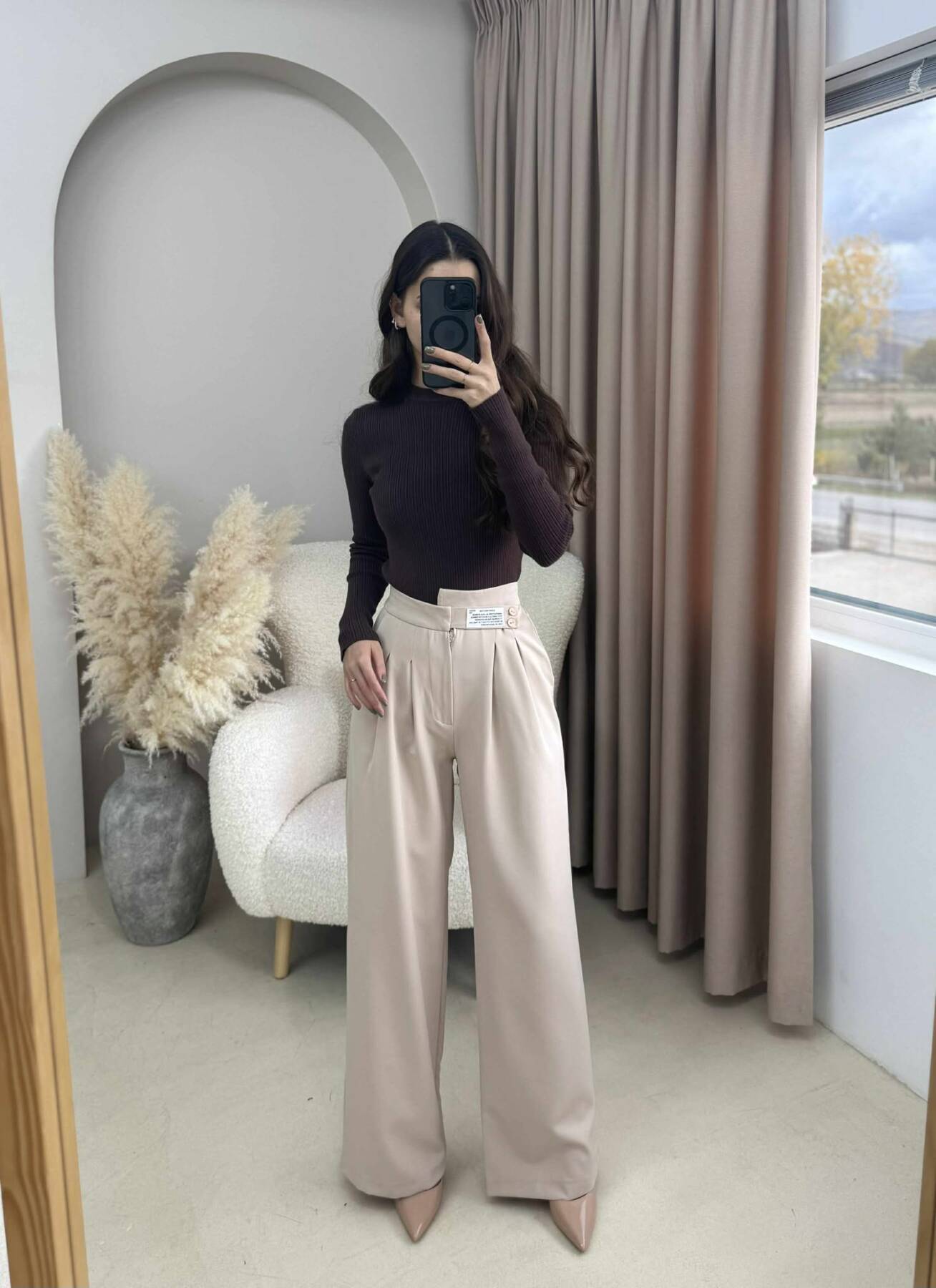 ONE COLOR SEMI ELASTIC WAIST WIDE LEG WOMEN TROUSERS BROWN/KAFE