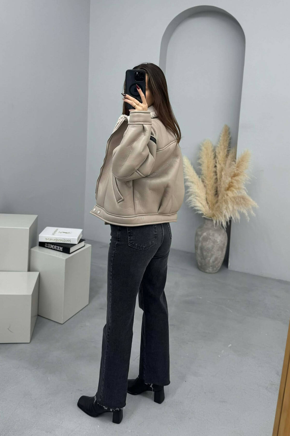 BELT DETAILS FLUFFY WOMEN JACKET DARK GREY/GEE