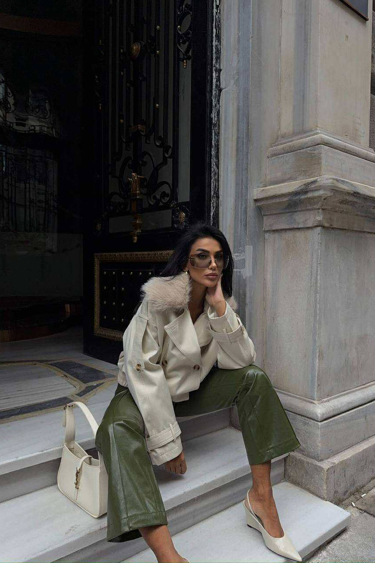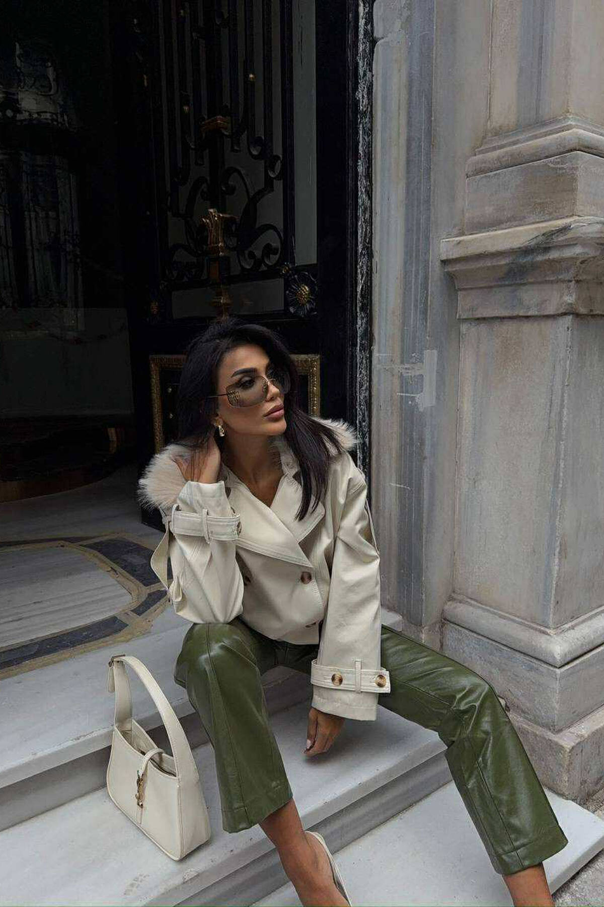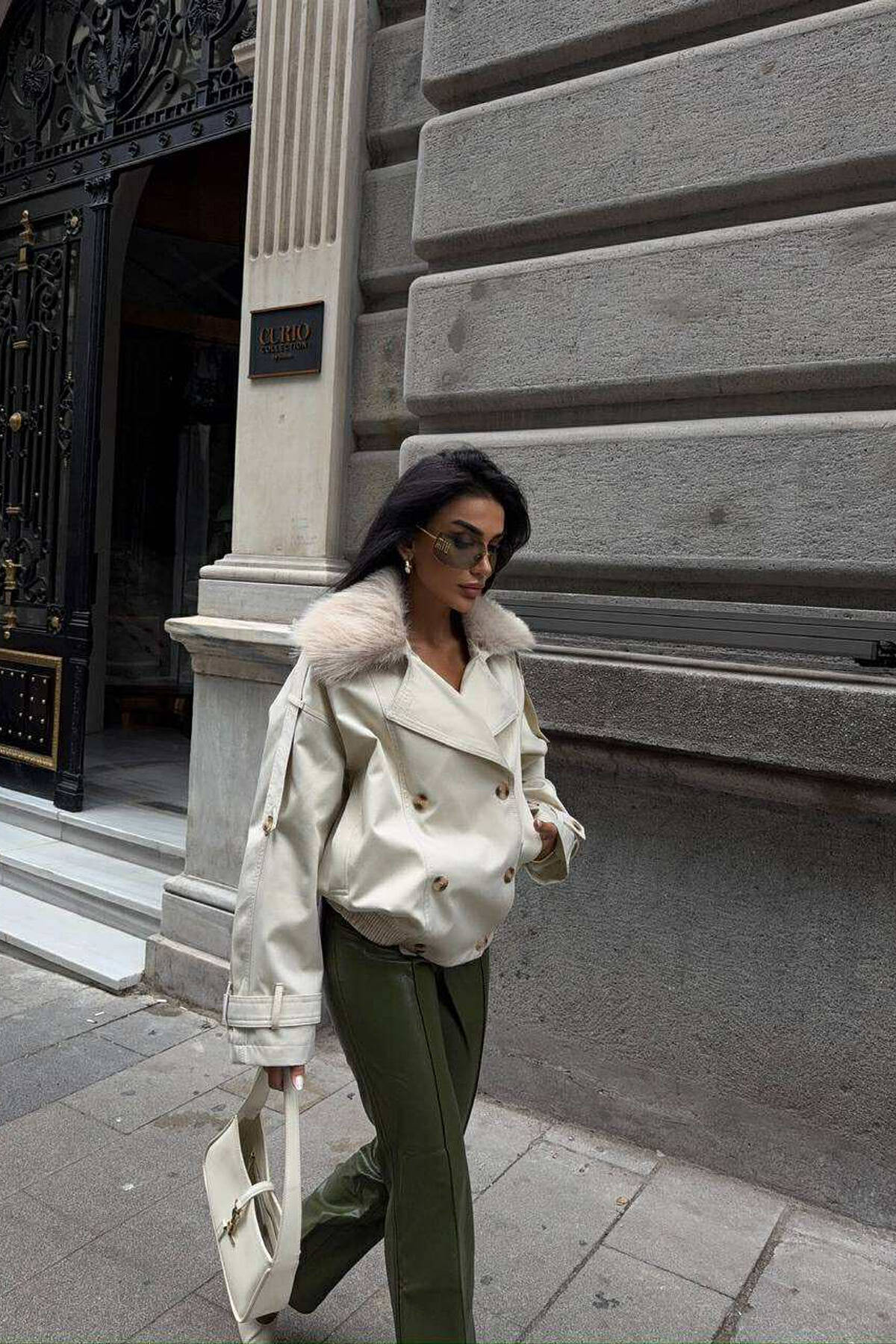 XHAKETË E SHKURTËR ME DETAJE BUTONASH DHE JAKË ME PUSH PËR FEMRA NË NGJYRË KREM