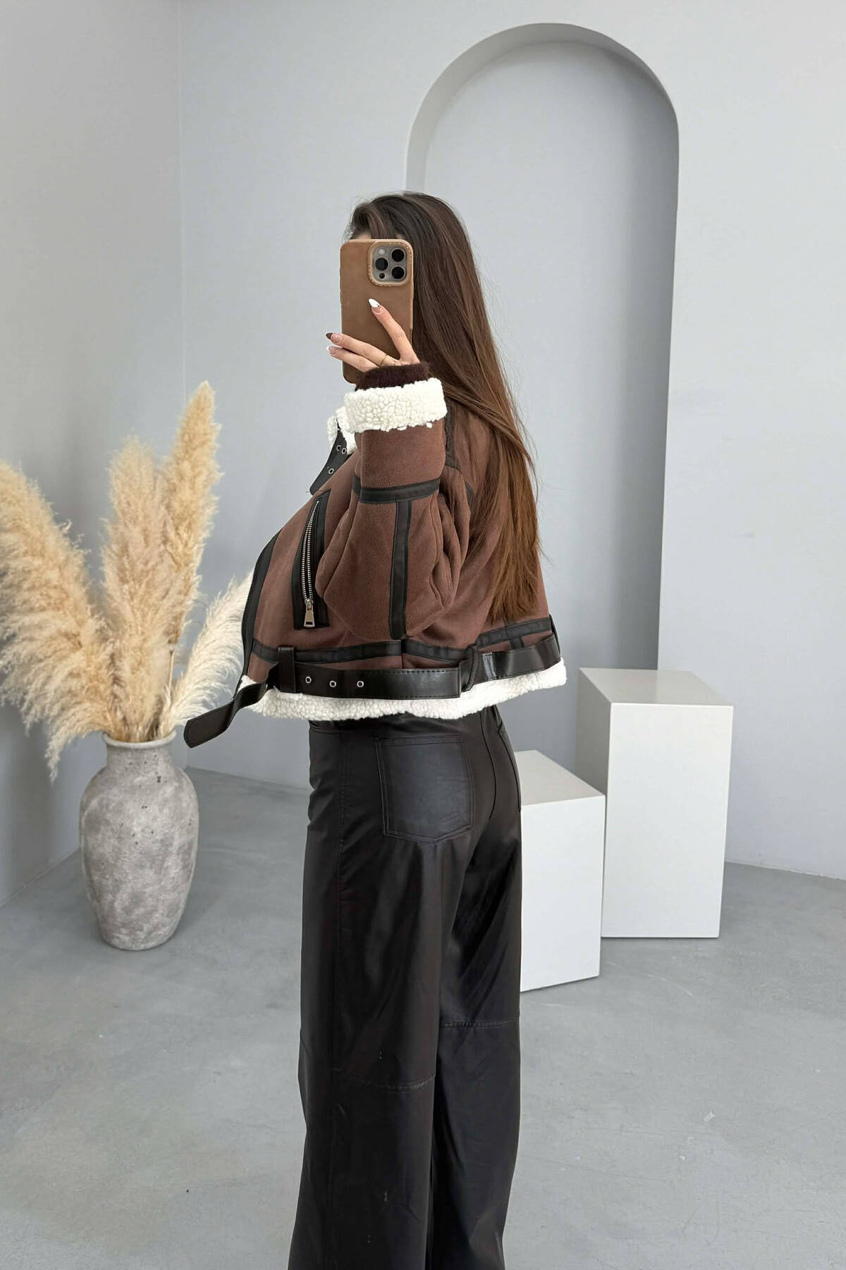 XHAKETE E SHKURTER NJE NGJYRESHE ME DETAJIN E RRIPIT PER FEMRA NE NGJYRE KAFE TE ERRET