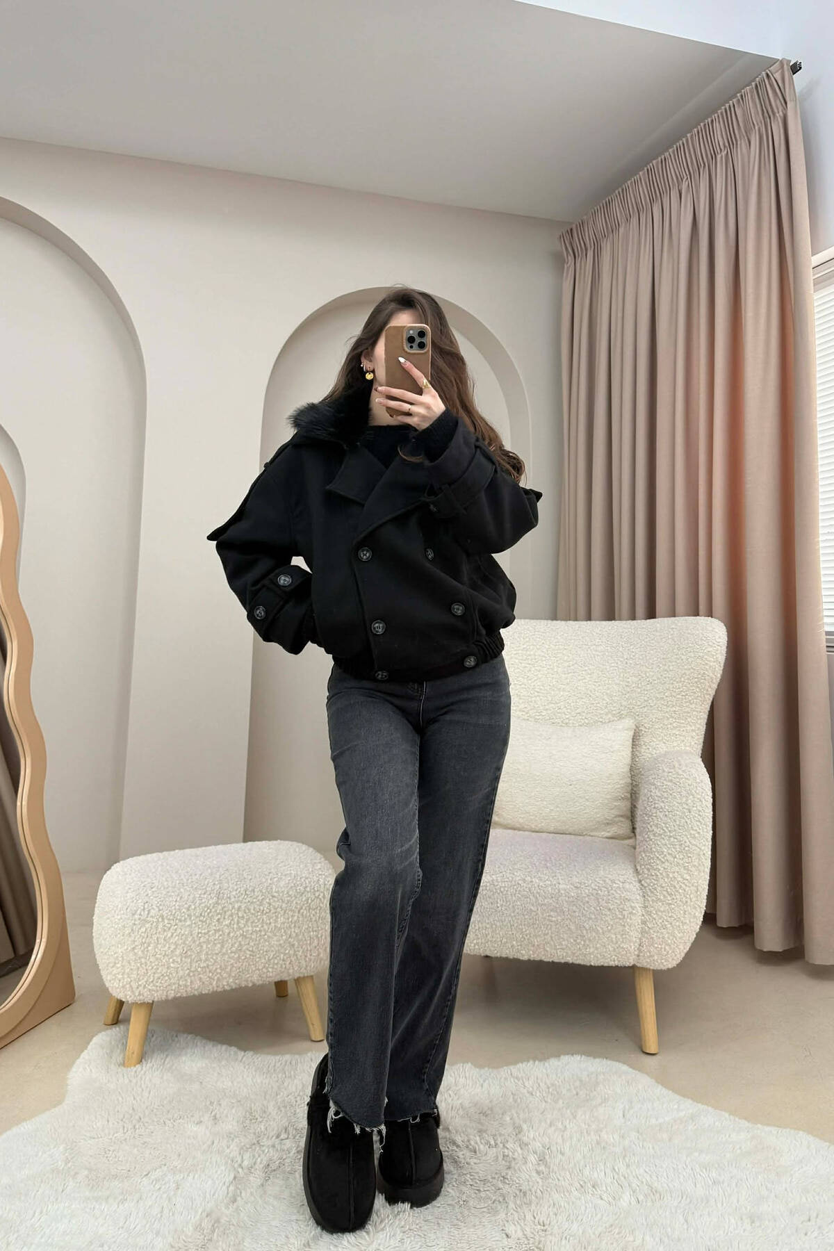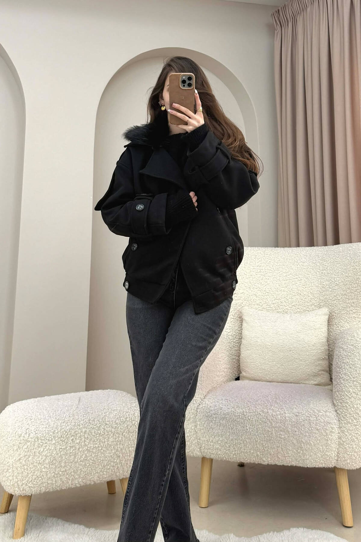 PALLTO E THJESHTE NJE NGJYRESHE ME BUTONA DHE ME DETAJIN E SHALLIT PER FEMRA NE NGJYRE BEZHE