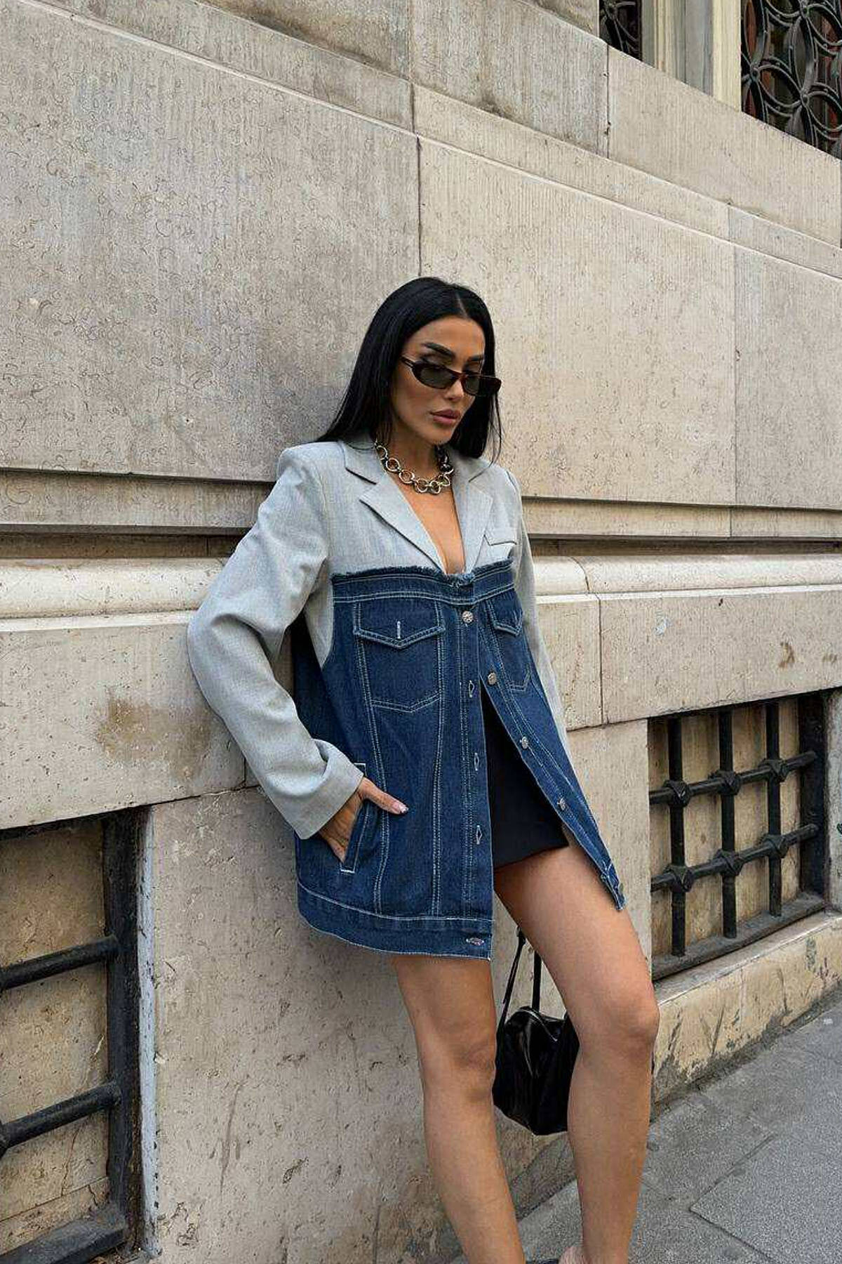XHAKETË E THJESHTË ME DIZAJN GJYSËM XHINS PËR FEMRA NË NGJYRËN GRI