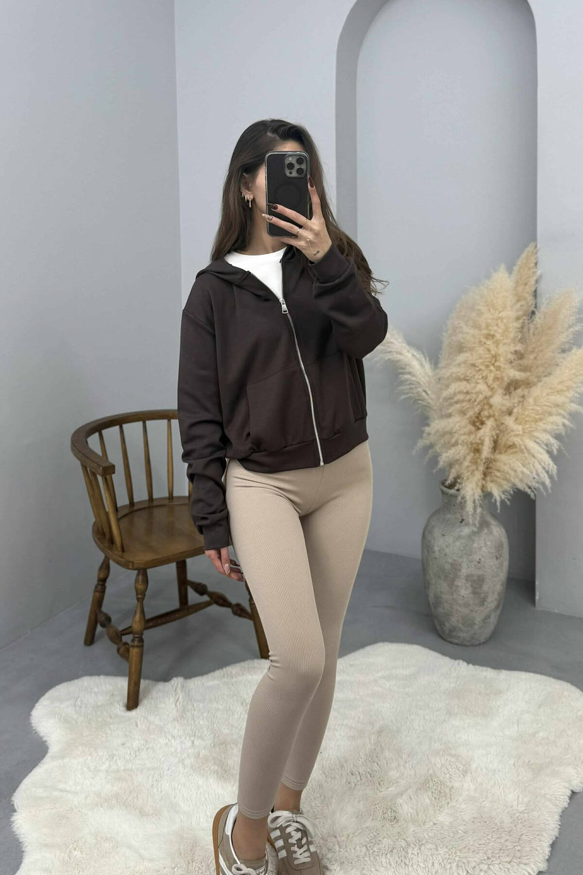 XHAKETE E THJESHTE NJE NGJYRESHE ME KAPUÇ DHE ZINXHIR PER FEMRA NE NGJYRE KAFE
