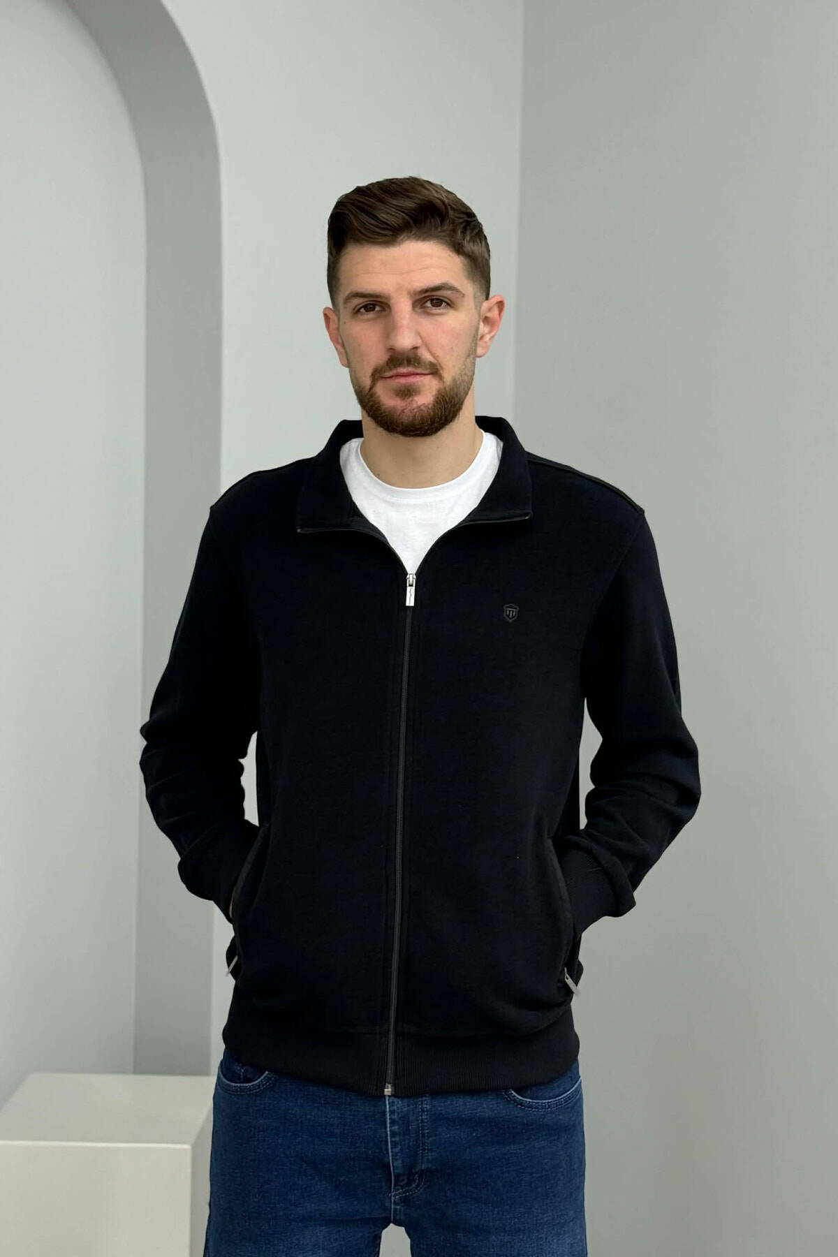 XHAKETË E THJESHTË NJËNGJYRËSHE ME JAKË ME ZINXHIR PËR MESHKUJ NË NGJYRËN BLU MARINË