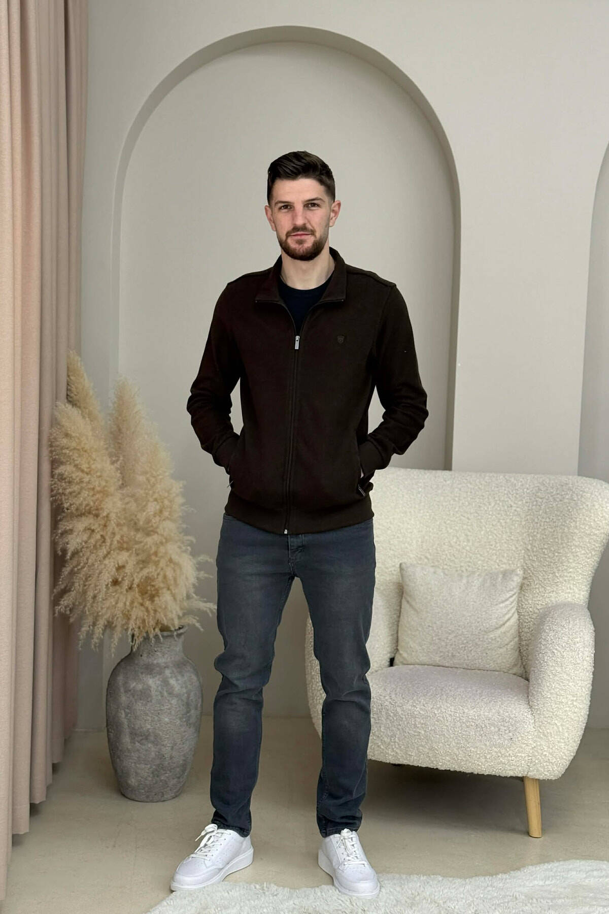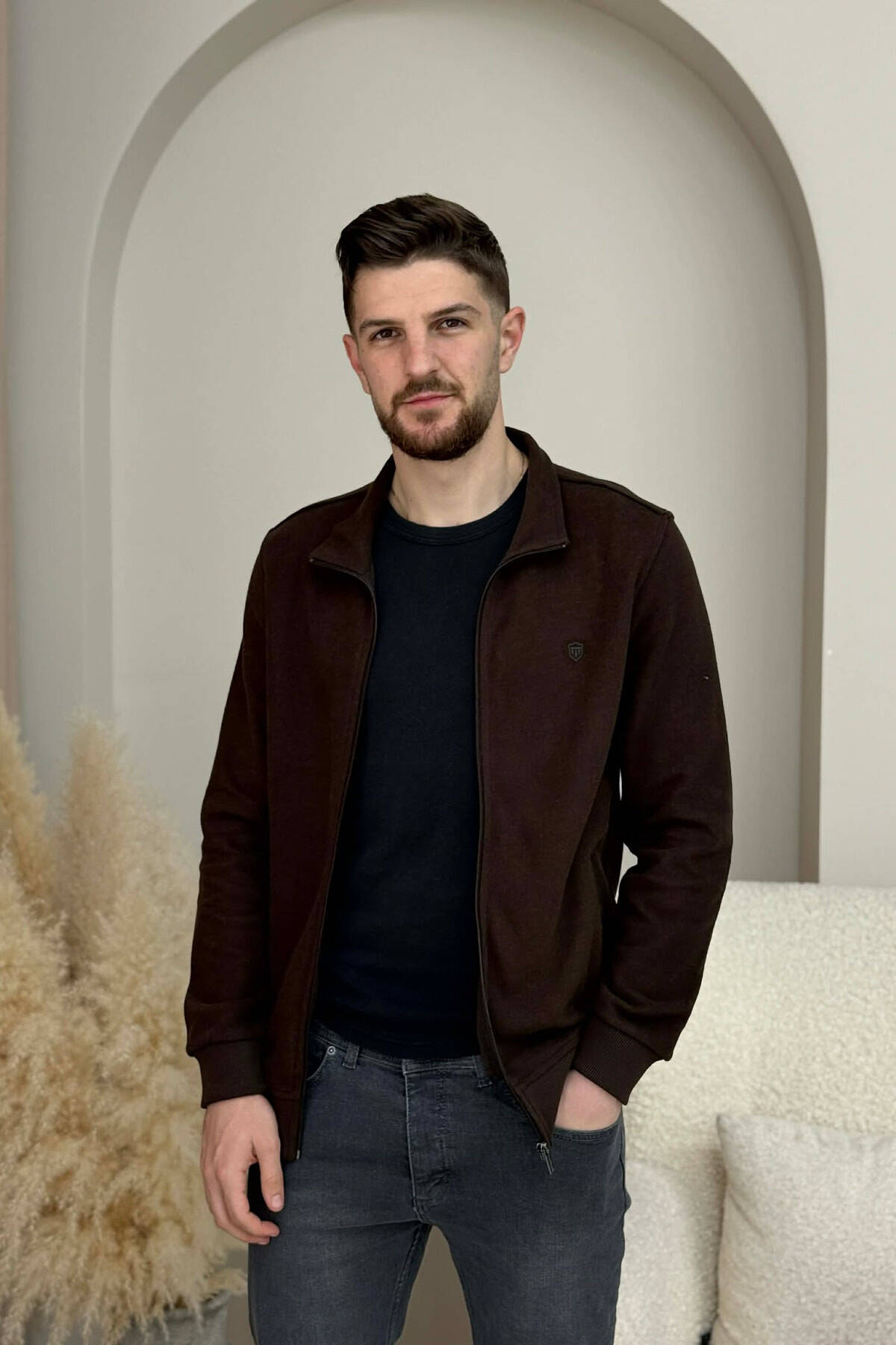XHAKETË E THJESHTË NJËNGJYRËSHE ME JAKË ME ZINXHIR PËR MESHKUJ NË NGJYRËN KAFE