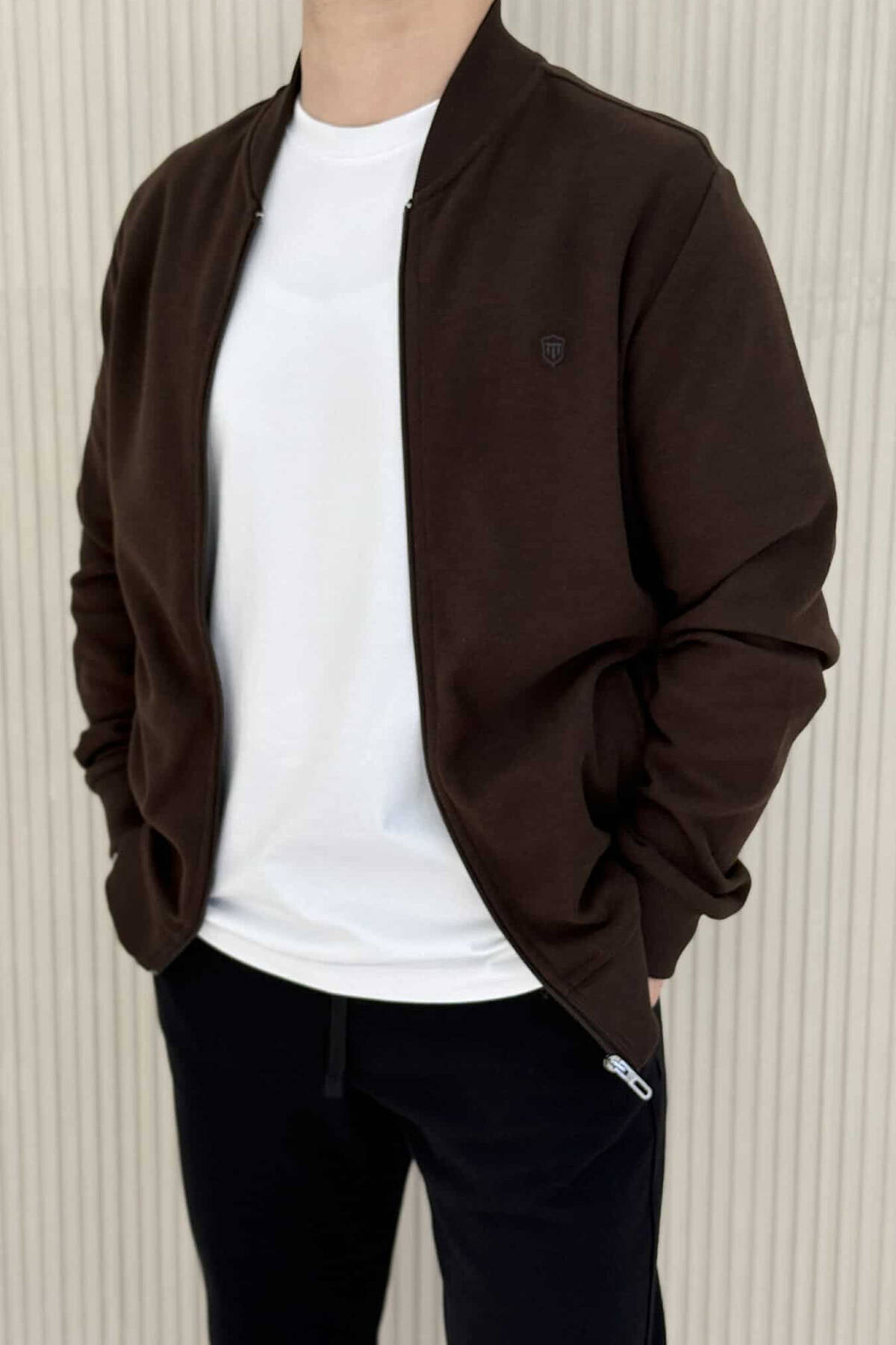 XHAKETË E THJESHTË NJËNGJYRËSHE ME JAKË ME ZINXHIR PËR MESHKUJ NË NGJYRËN KAFE