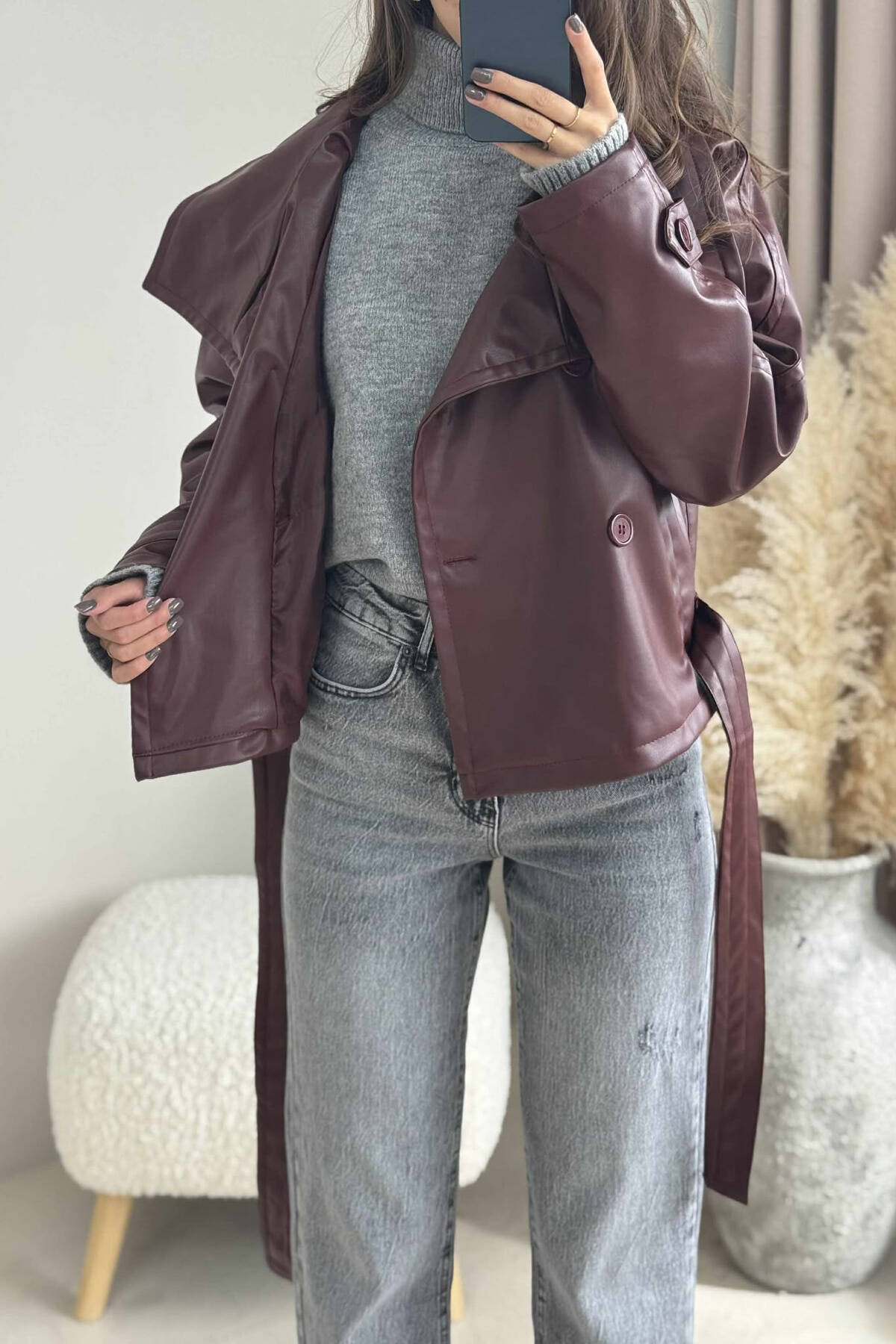 XHAKETË LËKURE NJË NGJYRËSHE ME LIDHËSE PËR FEMRA NË NGJYRËN VISHNJË