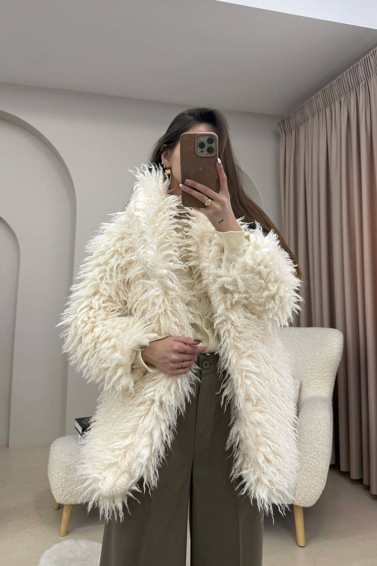 ONE COLOR BUTTONED FAUX FUR SHORT WOMAN COAT CREAM/KREM