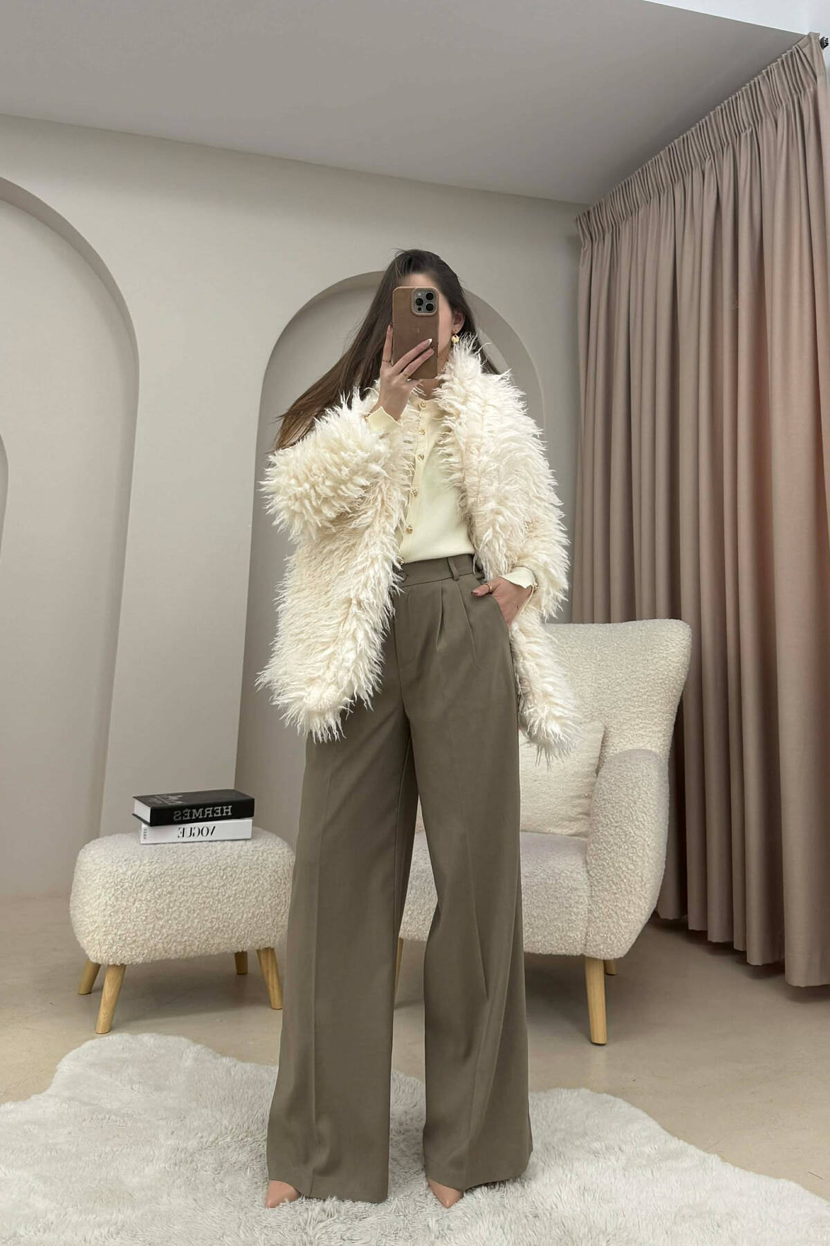 PALLTO PELLUSHI ME KAPUÇ DHE BUTONA PER FEMRA NE NGJYRE KREM