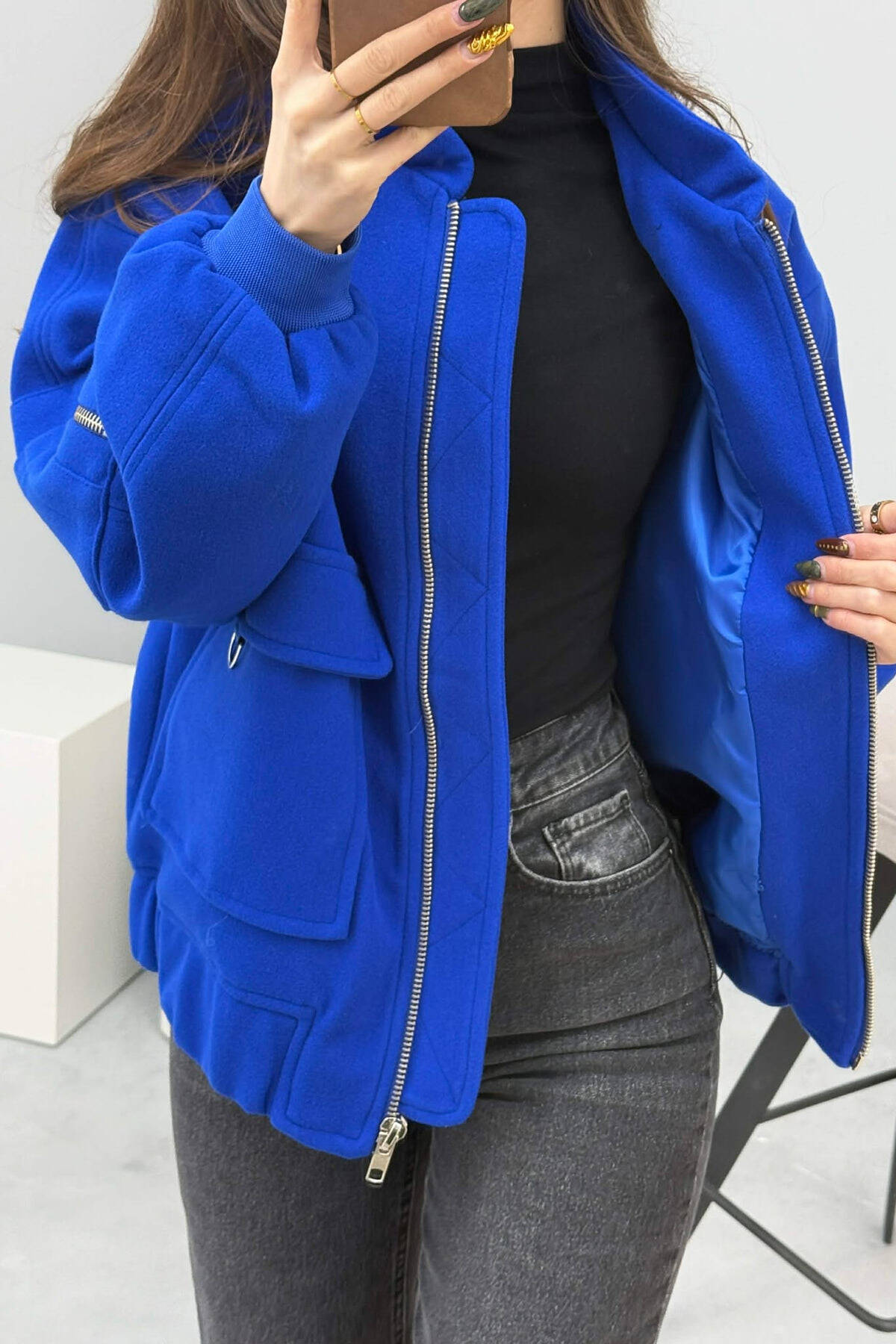 XHAKETE KLASIKE NJE NGJYRESHE ME BUTONA GOLD PER FEMRA NE NGJYRE BLU TE ZBARDHUR