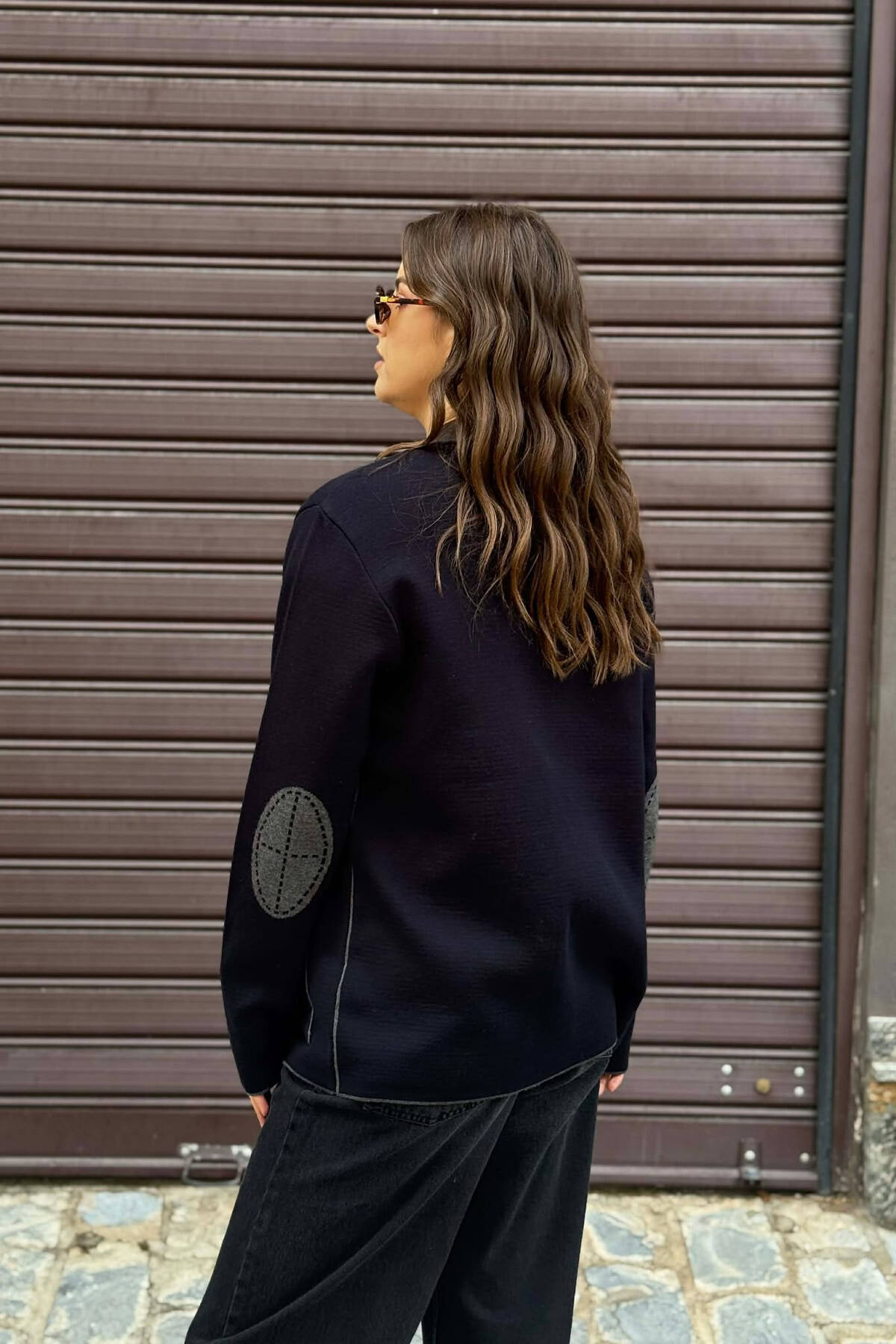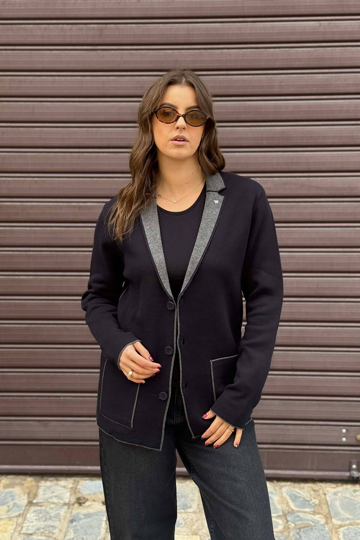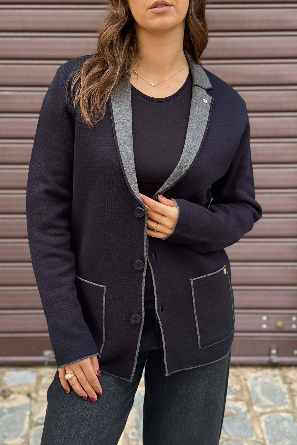 XHAKETË ME KOPSA TË THJESHTA DHE ME DETAJIN E XHEPAVE PËR FEMRA NË NGJYRË BLU TË ERRËT