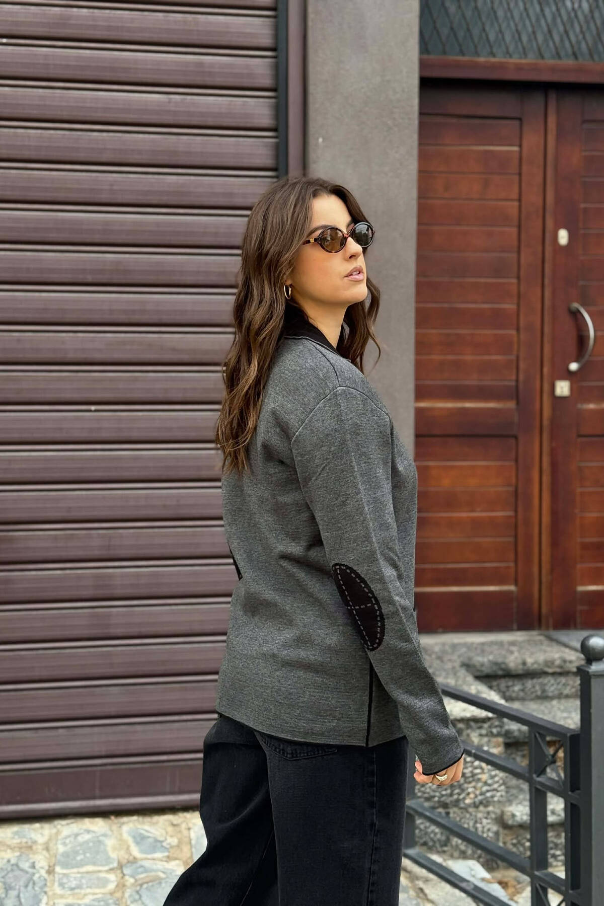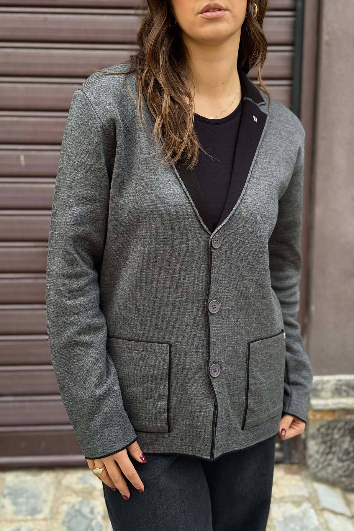 XHAKETË ME KOPSA TË THJESHTA DHE ME DETAJIN E XHEPAVE PËR FEMRA NË NGJYRË GRI TË ERRËT